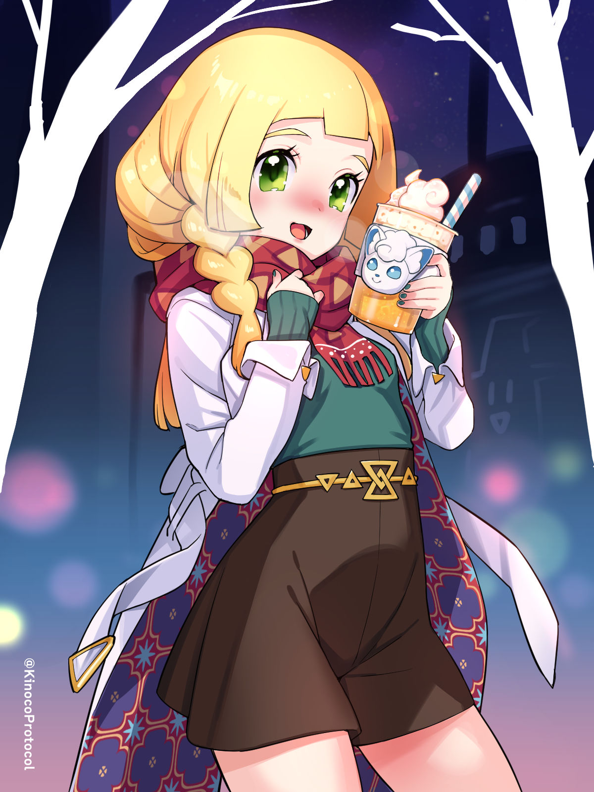 1girl :d alolan_form alolan_vulpix blonde_hair blunt_bangs blush braid brown_shorts character_print coat commentary_request cosplay cup dessert drinking_straw elesa_(palentine's_2023)_(pokemon) elesa_(pokemon) elesa_(pokemon)_(cosplay) eyelashes food gen_7_pokemon green_eyes green_shirt high-waist_shorts highres holding holding_cup kinocopro lillie_(pokemon) long_hair long_sleeves lower_teeth_only night nintendo open_clothes open_coat open_mouth outdoors pokemon pokemon_masters_ex pokemon_sun_and_moon red_scarf scarf shirt shorts sky sleeves_past_wrists smile solo teeth tongue twitter_username watermark white_coat