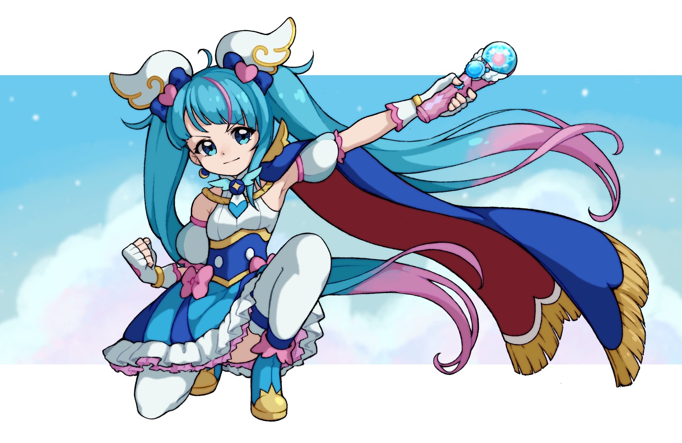 1girl ahoge blue_eyes blue_hair bow brooch cape commentary cure_sky detached_sleeves earrings english_commentary fingerless_gloves gloves gradient_hair hair_ornament highres hirogaru_sky!_precure jewelry magical_girl multicolored_hair pink_bow pink_hair precure puffy_detached_sleeves puffy_sleeves rosa_(minkyrosa) single_sidelock sky_mirage solo sora_harewataru thighhighs twintails two-sided_cape two-sided_fabric white_gloves white_thighhighs wing_brooch wing_hair_ornament
