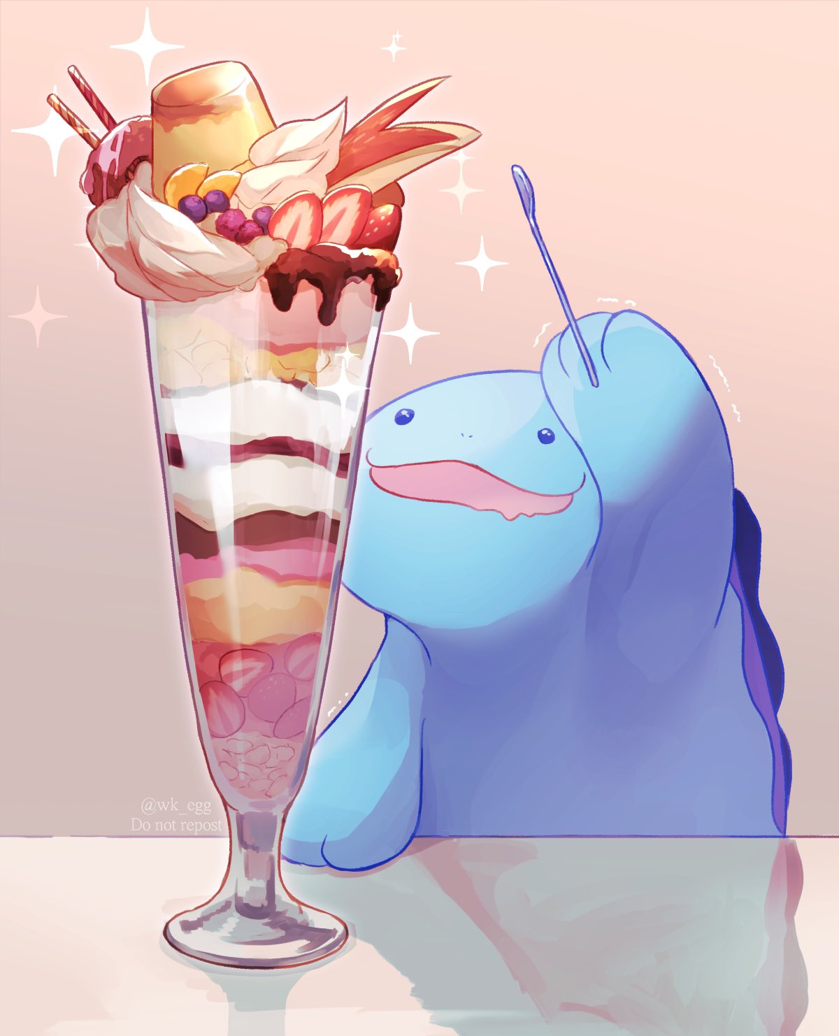 :d blue_eyes commentary_request dessert drooling eko_(wk_egg) food gen_2_pokemon highres holding holding_spoon looking_up mouth_drool nintendo no_humans open_mouth parfait pokemon pokemon_(creature) quagsire reflection smile solo sparkle spoon trembling twitter_username watermark
