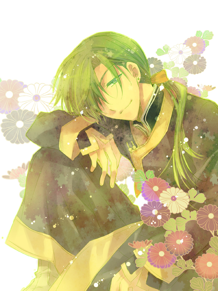 1boy akatsuki_no_yona closed_mouth flower gimmick-asahi green_hair hair_ribbon jae-ha_(akatsuki_no_yona) korean_clothes long_hair long_sleeves looking_at_viewer low_ponytail male_focus ponytail purple_flower red_flower ribbon smile solo white_background white_flower