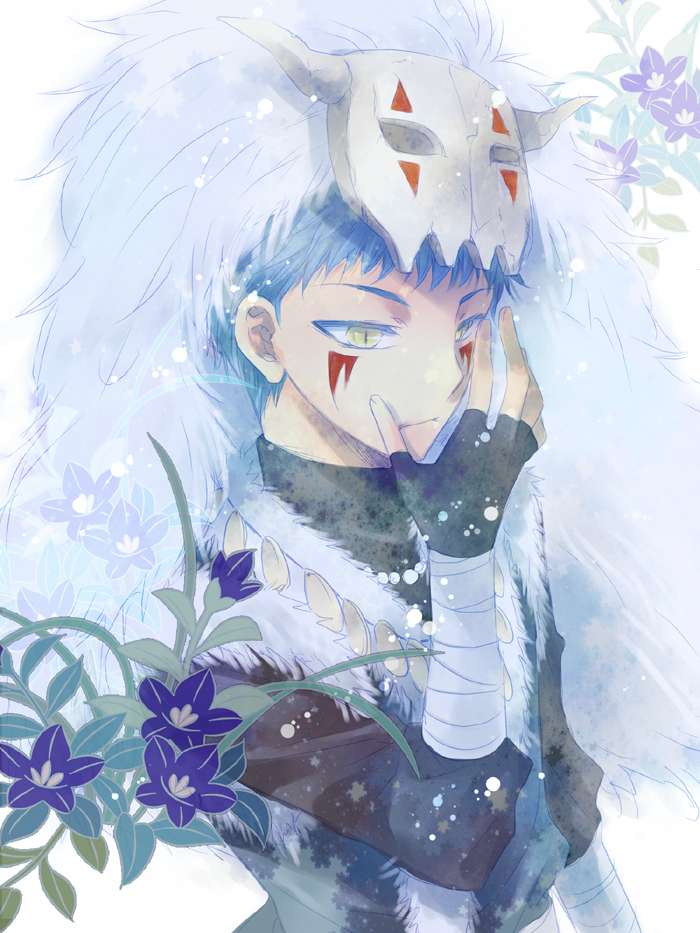 1boy akatsuki_no_yona bandages black_gloves blue_flower blue_hair closed_mouth facial_mark facing_to_the_side fingerless_gloves flower gimmick-asahi gloves korean_clothes looking_at_viewer male_focus short_hair shin-ah_(akatsuki_no_yona) slit_pupils solo white_background yellow_eyes