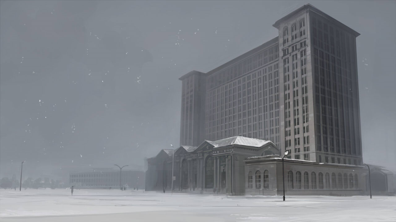 building city detroit grey_sky grey_theme lamppost landscape michigan_central_station no_humans real_world_location realistic scenery seo_tatsuya sky snow snowing train_station tree united_states winter