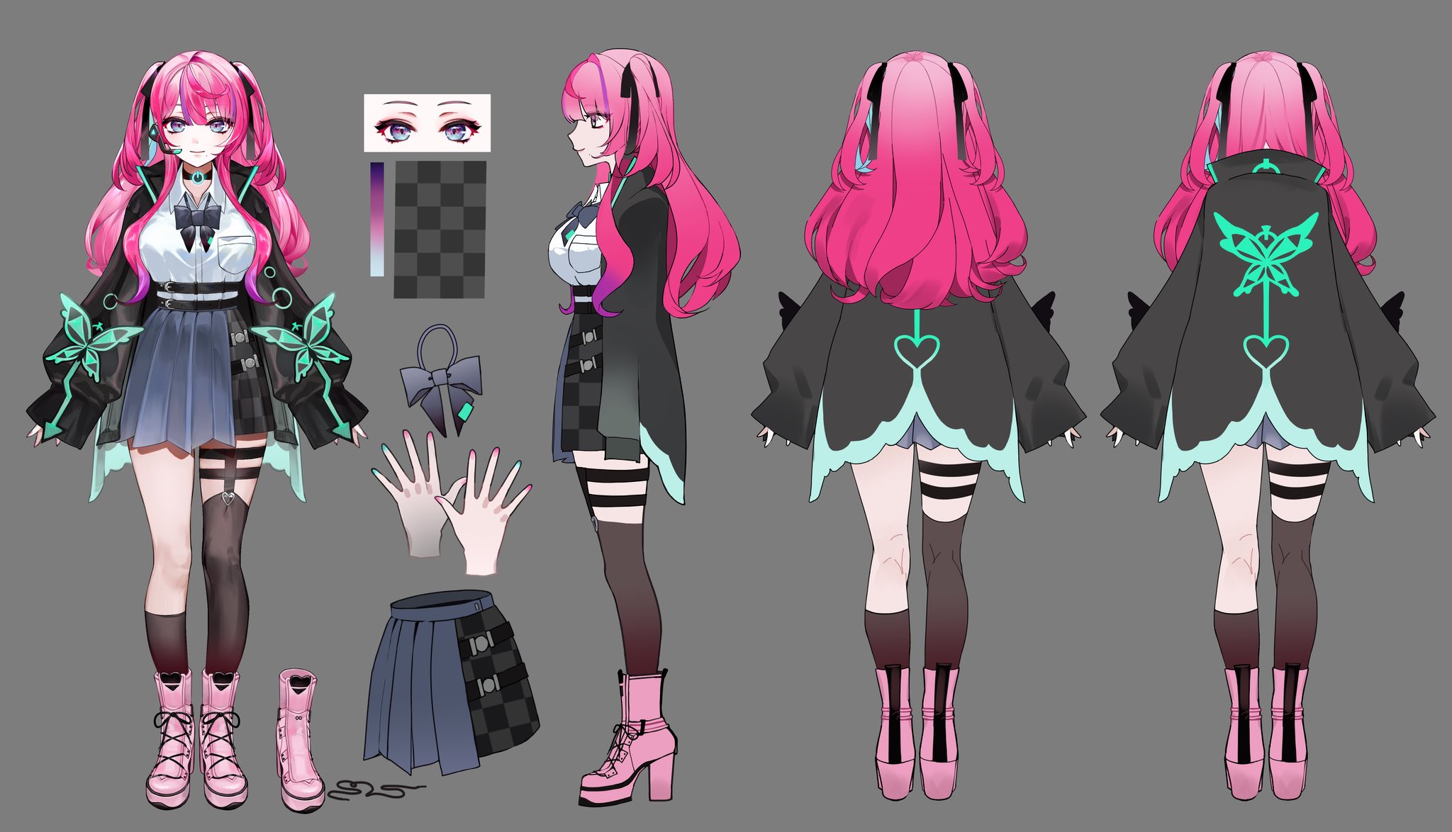1girl animal_print aqua_jacket aqua_nails asymmetrical_legwear belt black_choker black_jacket black_ribbon black_skirt black_socks black_thighhighs blue_bow blue_bowtie blue_eyes blue_hair blue_skirt boots bow bowtie bug butterfly butterfly_ornament butterfly_print checkered_clothes checkered_skirt choker collared_jacket color_guide commentary_request facing_viewer from_behind from_side grey_background hair_ribbon high_belt high_heel_boots high_heels highres himeragi_ageha insect jacket kneehighs lace-up_boots legwear_garter long_hair microphone moko_(moko/moko) mole mole_under_mouth multicolored_hair multicolored_nails multicolored_skirt multiple_belts multiple_views neon_trim pink_boots pink_hair pink_nails pleated_skirt power_symbol purple_hair reference_sheet ribbon school_uniform shirt sidelocks single_kneehigh single_sock single_thighhigh skirt socks streaked_hair thighhighs two_side_up uneven_legwear virtual_youtuber wactor_production white_shirt wide_sleeves