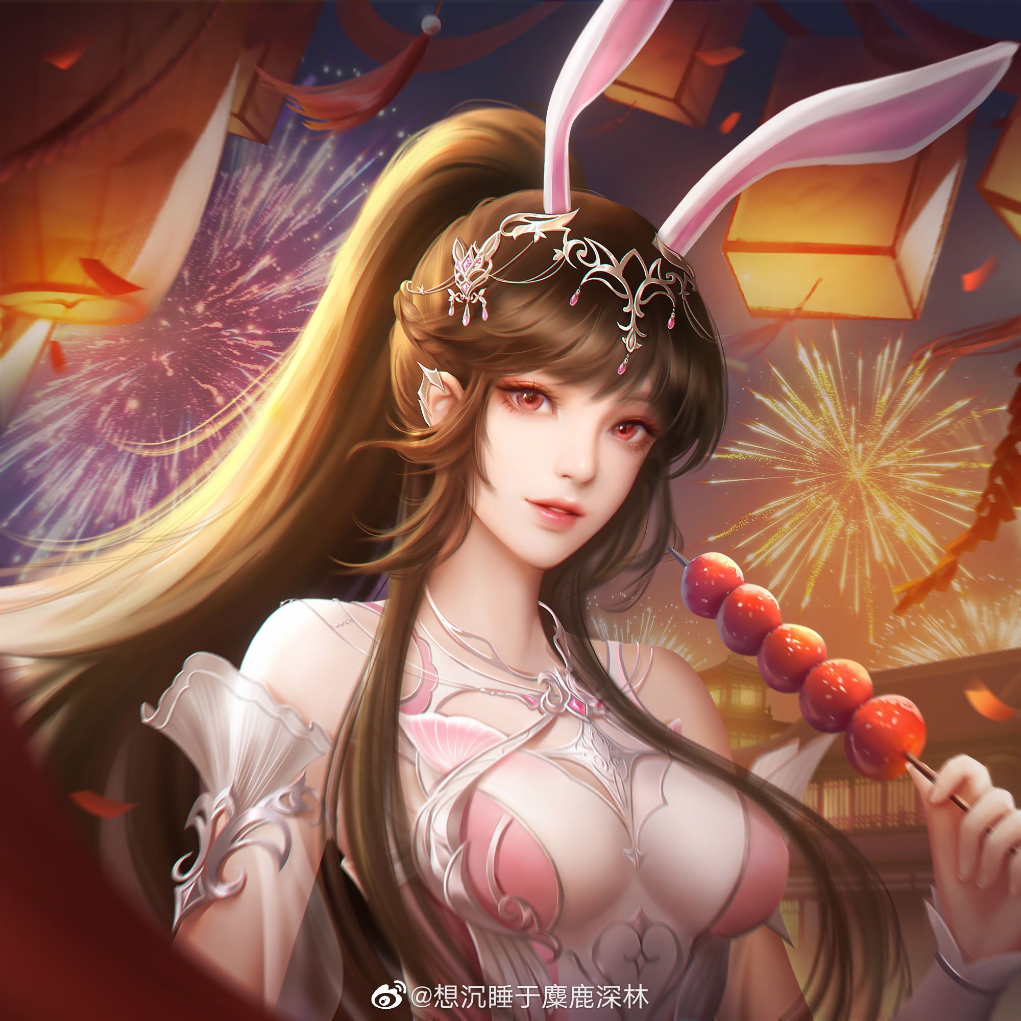1girl aerial_fireworks animal_ears brown_hair building dango douluo_dalu fireworks food hair_ornament highres lantern long_hair new_year night parted_lips ponytail rabbit_ears sidelocks solo tassel teeth upper_body wagashi xiang_chenshui_yu_milu_shenlin xiao_wu_(douluo_dalu)