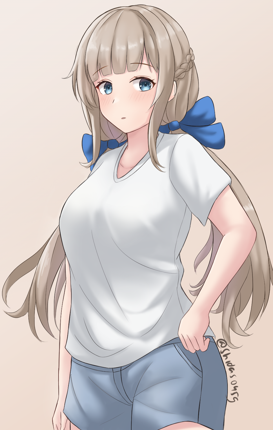 1girl alternate_costume blue_bow blue_eyes bow braid breasts brown_background casual cowboy_shot french_braid grey_shorts hair_bow highres kantai_collection large_breasts light_brown_hair long_hair low_twintails maryland_(kancolle) shidas0459 shirt short_shorts short_sleeves shorts simple_background solo standing t-shirt twintails white_shirt