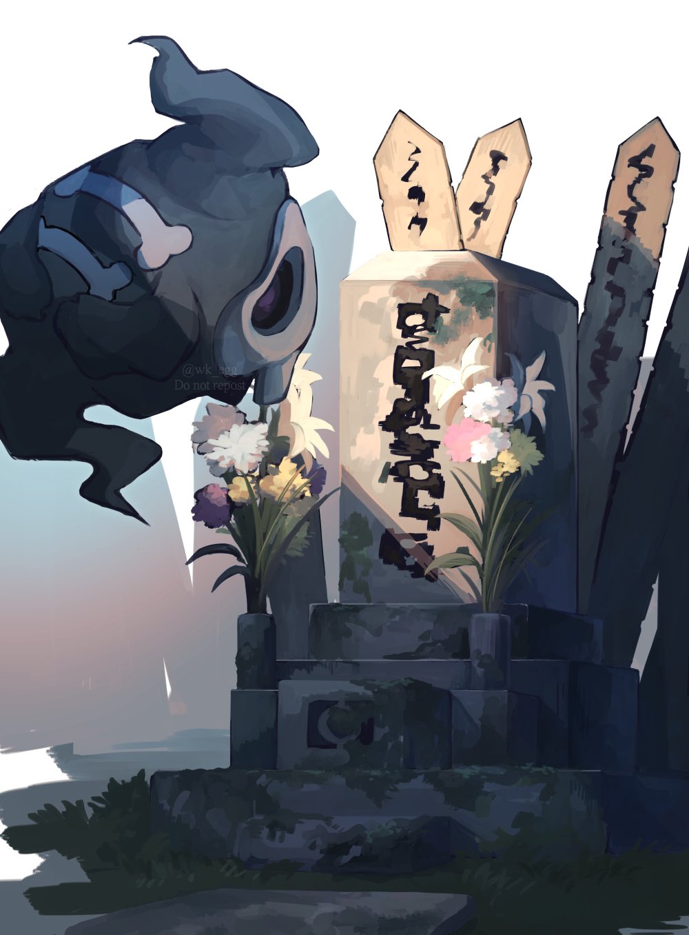 commentary_request duskull eko_(wk_egg) floating flower gen_3_pokemon highres moss nintendo no_humans pokemon pokemon_(creature) purple_eyes solo tombstone twitter_username watermark white_flower