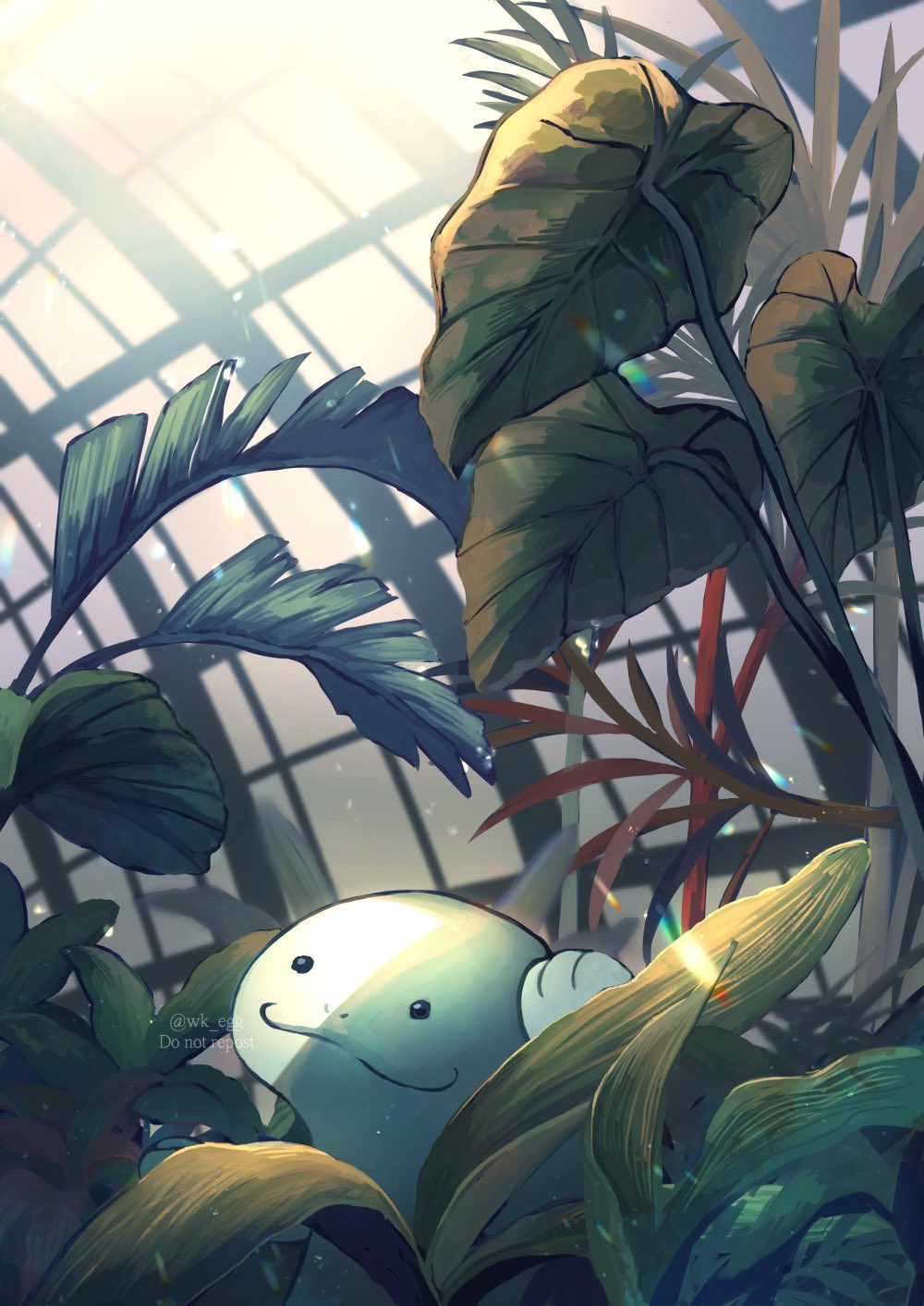 black_eyes closed_mouth commentary_request eko_(wk_egg) gen_2_pokemon greenhouse highres leaf nintendo no_humans pokemon pokemon_(creature) quagsire smile solid_circle_eyes twitter_username watermark