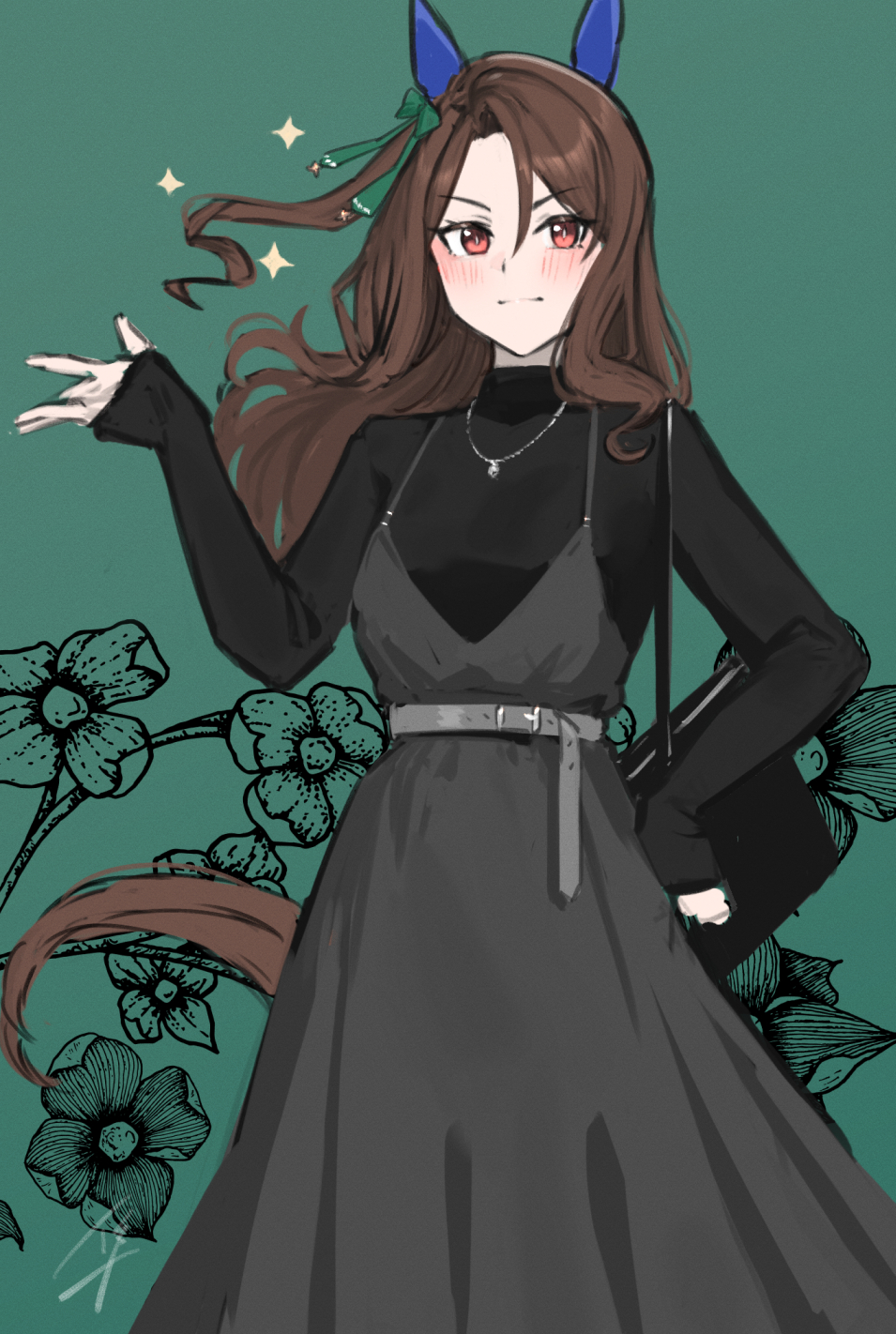 1girl alternate_costume animal_ears bag belt black_bag black_sweater blush brown_hair closed_mouth commentary dress ear_covers floral_background green_background grey_belt grey_dress hair_between_eyes hair_ornament hand_on_own_chest hand_on_own_hip hand_up hayabusa_(vert_320) highres horse_ears horse_girl horse_tail jewelry king_halo_(umamusume) long_hair long_sleeves looking_at_viewer necklace one_side_up red_eyes shoulder_bag signature sleeves_past_wrists smile solo sparkle sweater untranslatable_commentary tail turtleneck turtleneck_sweater umamusume