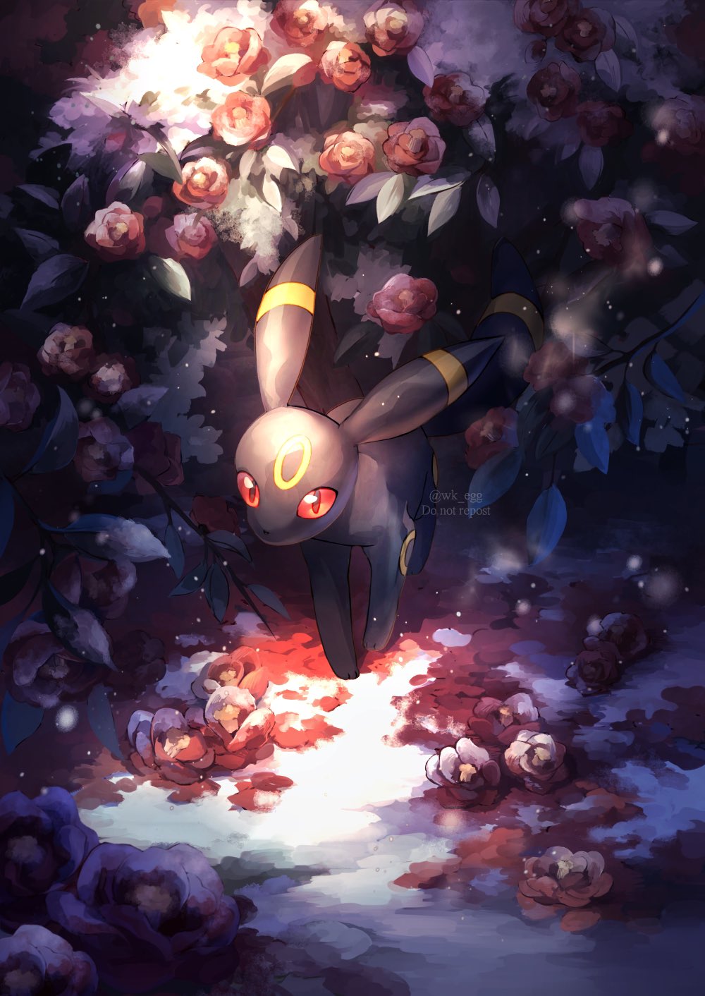 commentary_request eko_(wk_egg) flower gen_2_pokemon highres looking_at_viewer nintendo no_humans orange_eyes outdoors pokemon pokemon_(creature) snow solo standing twitter_username umbreon watermark