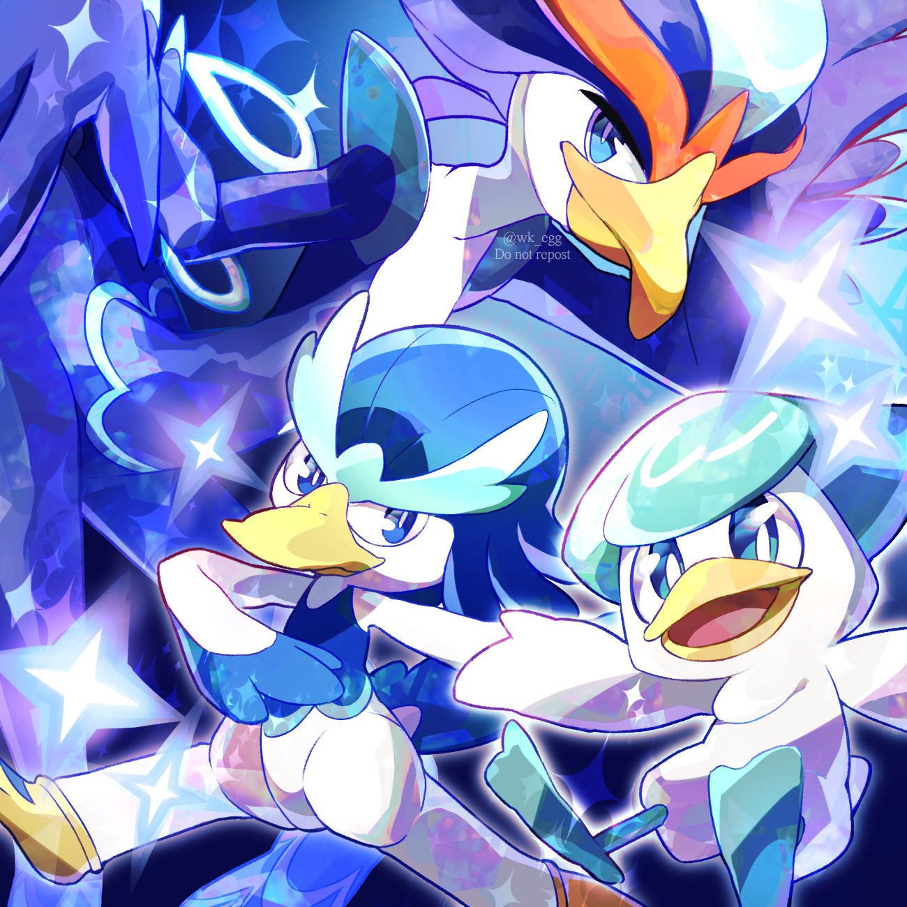 blue_eyes bright_pupils closed_mouth commentary_request eko_(wk_egg) evolutionary_line highres nintendo no_humans open_mouth pokemon pokemon_(creature) quaquaval quaxly quaxwell sparkle twitter_username watermark white_pupils