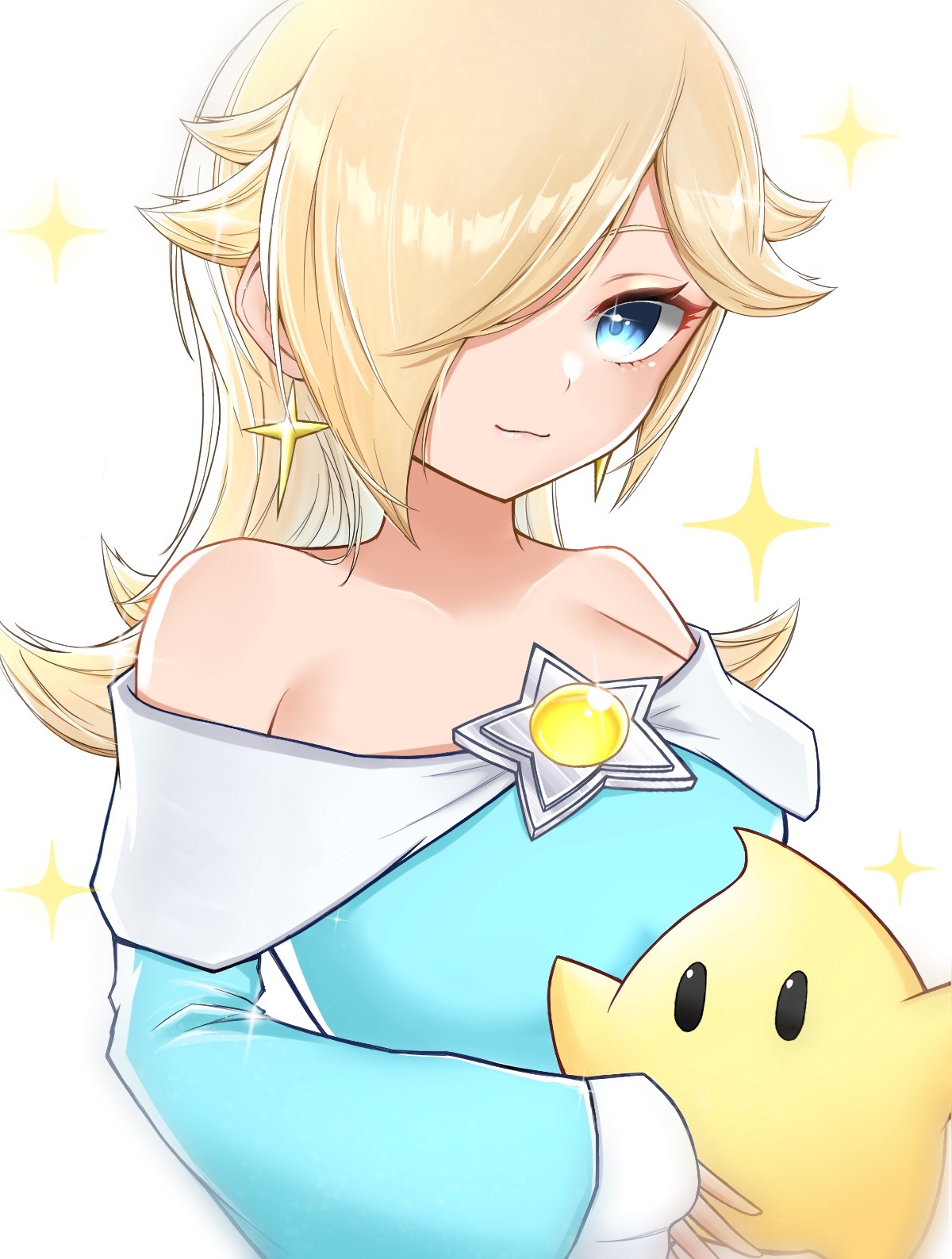 1girl aqua_dress blue_eyes brooch closed_mouth dress happy highres jewelry long_hair luma_(mario) mario_(series) nintendo off_shoulder rosalina simple_background smile sparkle super_mario_galaxy tomatomiya white_background