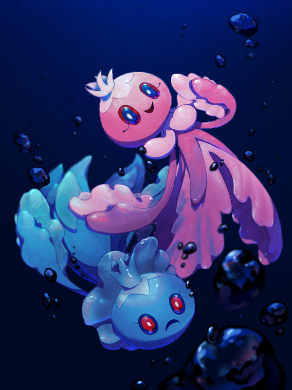 :d air_bubble blue_eyes blurry bright_pupils bubble commentary_request frillish frillish_(female) frillish_(male) gen_5_pokemon looking_at_viewer nintendo no_humans open_mouth pokemon pokemon_(creature) smile tondede_(yasz2223) underwater white_pupils