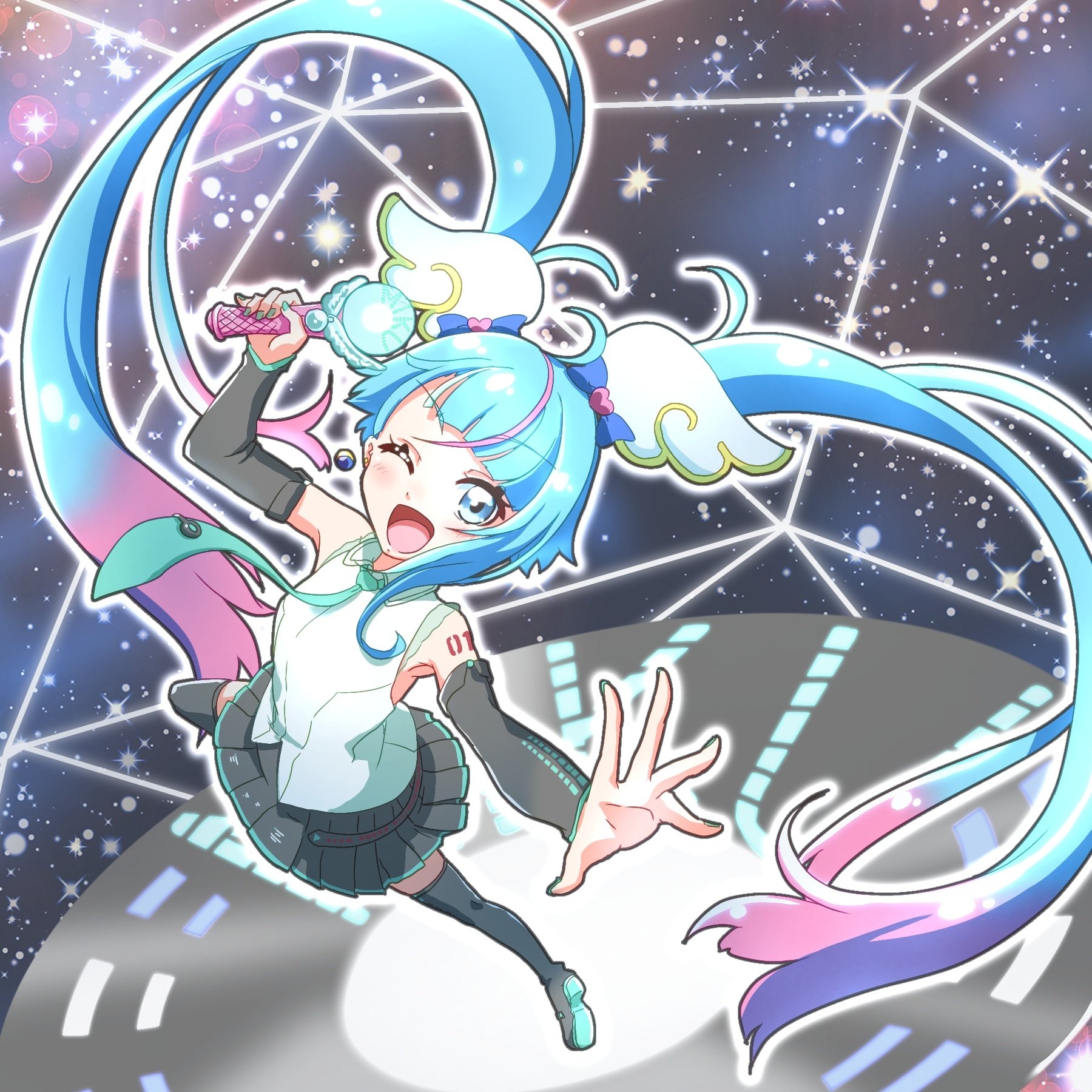 1girl ;d ahoge black_boots black_skirt black_sleeves blue_eyes blue_hair blue_nails blue_necktie boots commentary_request cosplay cure_sky detached_sleeves florence_temporary hair_ornament hatsune_miku hatsune_miku_(cosplay) highres hirogaru_sky!_precure long_hair magical_girl necktie one_eye_closed open_mouth pleated_skirt precure shirt skirt sky_mirage sleeveless sleeveless_shirt smile solo sora_harewataru thigh_boots twintails very_long_hair vocaloid white_shirt wing_hair_ornament