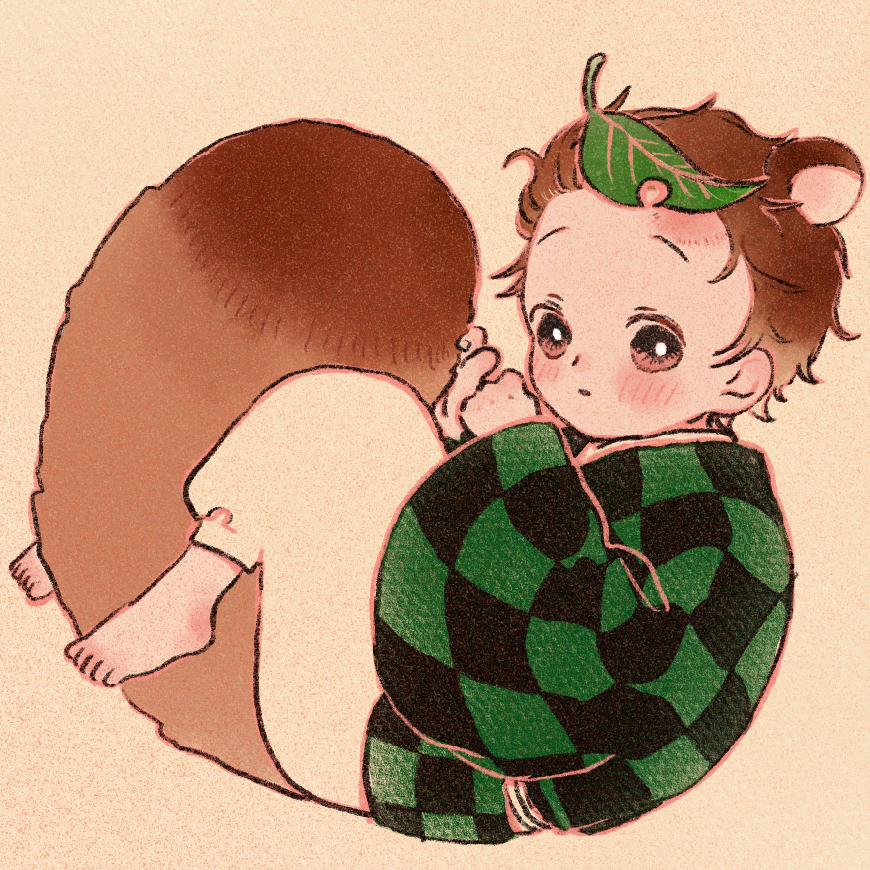 1boy aged_down animal_ears barefoot between_legs blush brown_hair checkered_clothes child extra_ears fetal_position from_side full_body green_kimono hair_slicked_back highres japanese_clothes kamado_tanjirou kemonomimi_mode kimetsu_no_yaiba kimono leaf leaf_on_head long_sleeves looking_at_viewer male_focus pants raccoon_boy raccoon_ears raccoon_tail sash scar scar_on_face scar_on_forehead short_hair simple_background siomy_0 solo tail tail_between_legs white_pants wide_sleeves