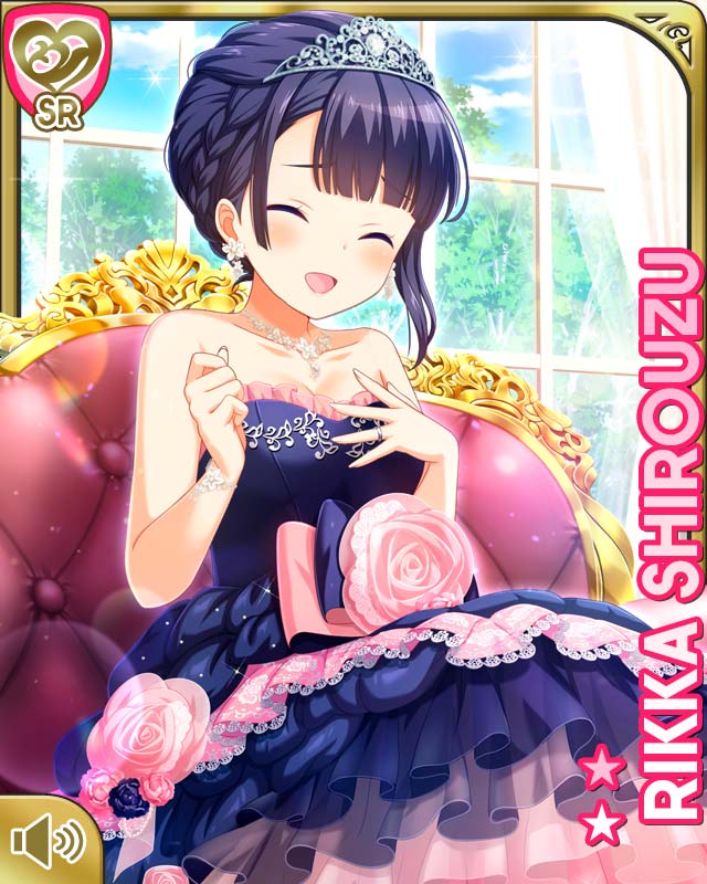 1girl :d black_dress black_hair bow braid breasts card_(medium) character_name closed_eyes collarbone day dress flower girlfriend_(kari) hair_bun indoors jewelry medium_hair necklace official_art open_mouth pink_flower pink_rose purple_eyes qp:flapper rose shirouzu_rikka sitting small_breasts smile solo tagme tiara uneven_bangs wedding_dress