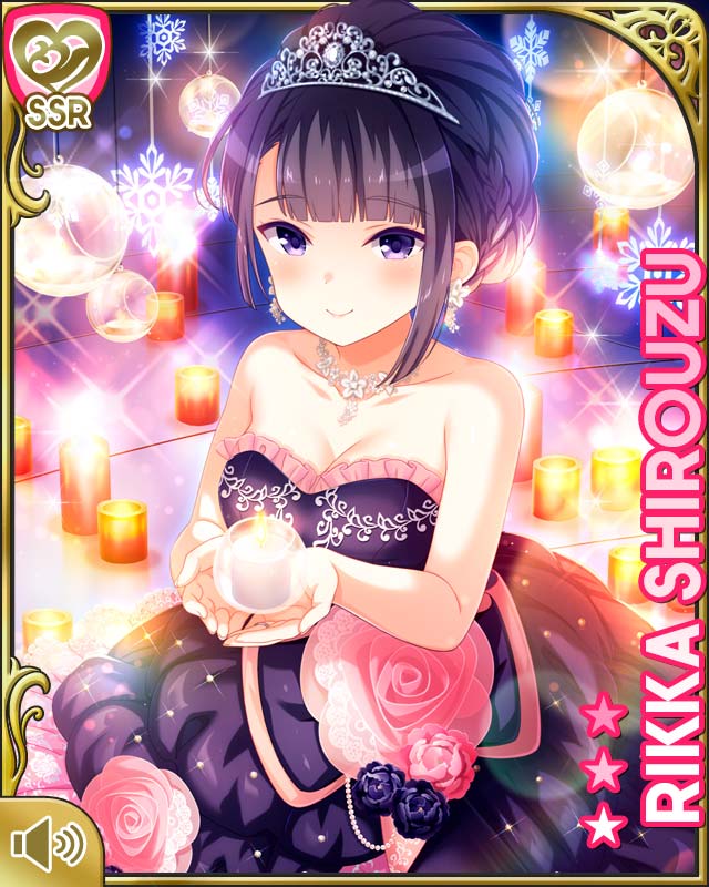 1girl black_dress black_hair bow braid breasts candle card_(medium) character_name collarbone dress flower girlfriend_(kari) hair_bun holding indoors jewelry medium_hair necklace nervous night official_art open_mouth pink_flower pink_rose purple_eyes qp:flapper rose shirouzu_rikka sitting small_breasts solo tagme tiara uneven_bangs wedding_dress
