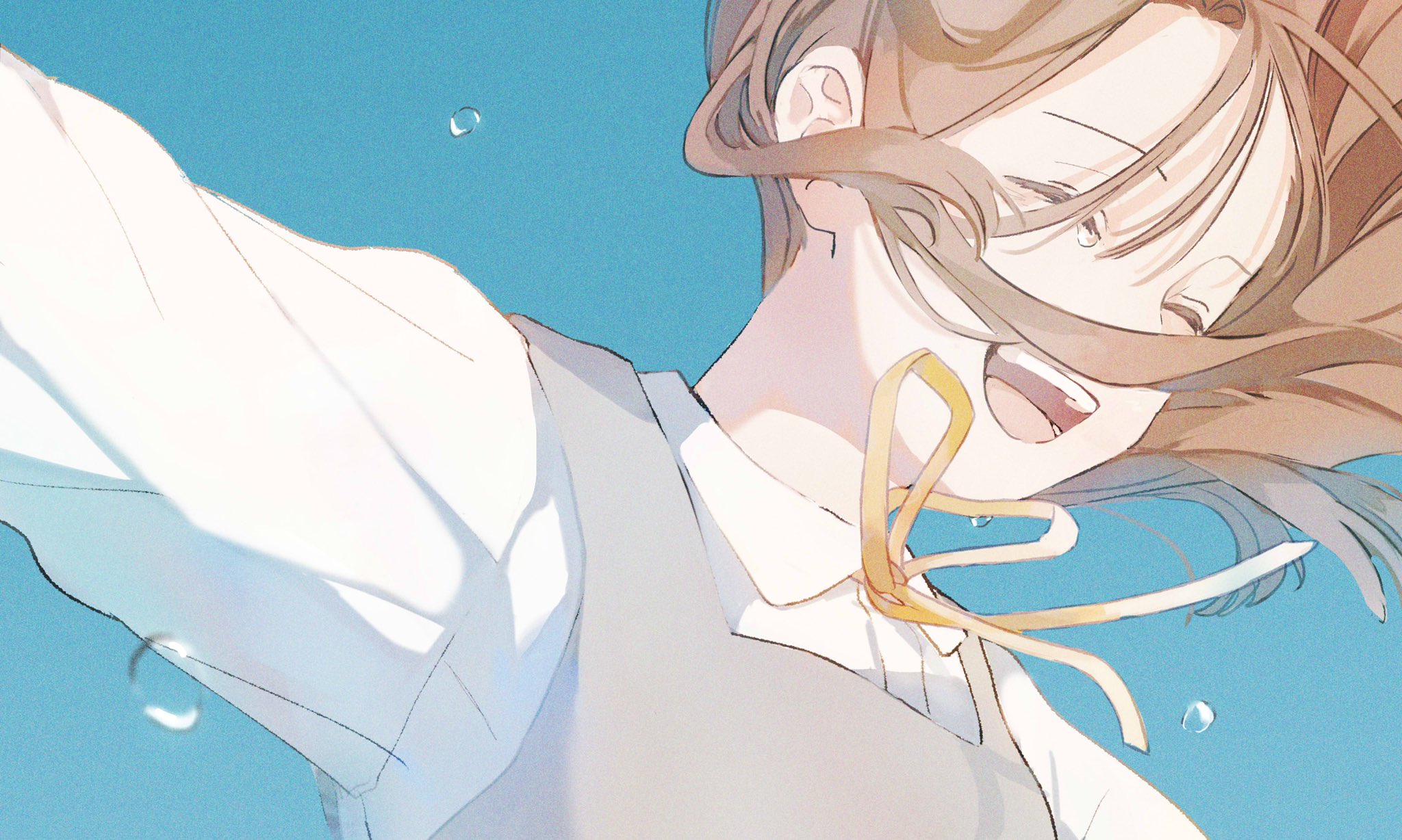 1girl black_vest blue_background blurry bow bowtie brown_hair closed_eyes crying depth_of_field floating_hair highres laughing long_sleeves open_mouth original outstretched_arms shirt simple_background solo spread_arms sunlight tears upper_body vest white_shirt yellow_bow yellow_bowtie yuribou