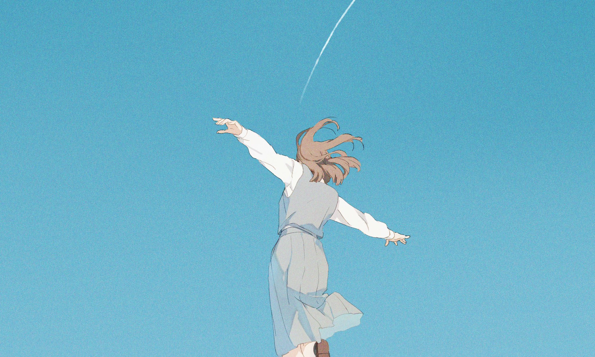 1girl blue_background blue_sky brown_hair brown_shoes clear_sky contrail day facing_away floating_hair from_behind grey_skirt grey_vest highres loafers long_sleeves original outstretched_arms pleated_skirt shirt shoe_soles shoes skirt skirt_set sky solo spread_arms standing standing_on_one_leg vest white_shirt yuribou