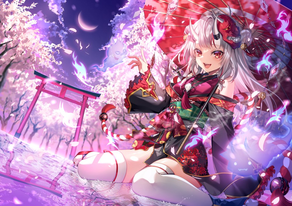1girl :d blush cherry_blossoms commentary_request crescent_moon hololive horns karma_(nakiri_ayame) kouhaku_nawa long_hair long_sleeves looking_at_viewer mask mask_on_head moon nakiri_ayame nakiri_ayame_(1st_costume) obi oil-paper_umbrella oni_mask open_mouth red_eyes reflection reflective_liquid rope sash shimenawa shiranui_(nakiri_ayame) sitting skin-covered_horns smile thighhighs torii umbrella urashima_(hidoro_mgmg) virtual_youtuber wariza white_hair white_thighhighs zettai_ryouiki