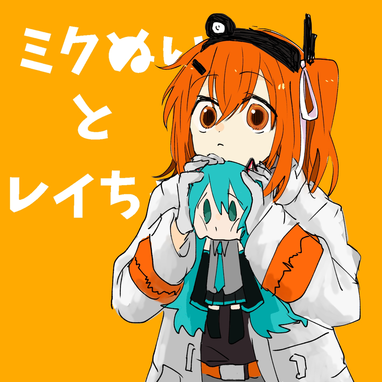 2girls a.i._voice adachi_rei aoiro88 aqua_hair aqua_necktie belt black_hairband black_shirt black_skirt black_sleeves chibi crossed_bangs detached_sleeves dot_nose gloves green_eyes grey_shirt hair_between_eyes hair_ornament hair_ribbon hairband hairclip hands_up hatsune_miku head_grab headlamp highres jacket light_frown long_sleeves looking_ahead multiple_girls necktie open_clothes open_jacket orange_eyes orange_hair pleated_skirt radio_antenna raised_eyebrows ribbon shirt side_ponytail skirt sleeveless sleeveless_shirt squishing twintails upper_body utau utility_belt vocaloid white_gloves white_jacket white_ribbon wide-eyed yellow_background