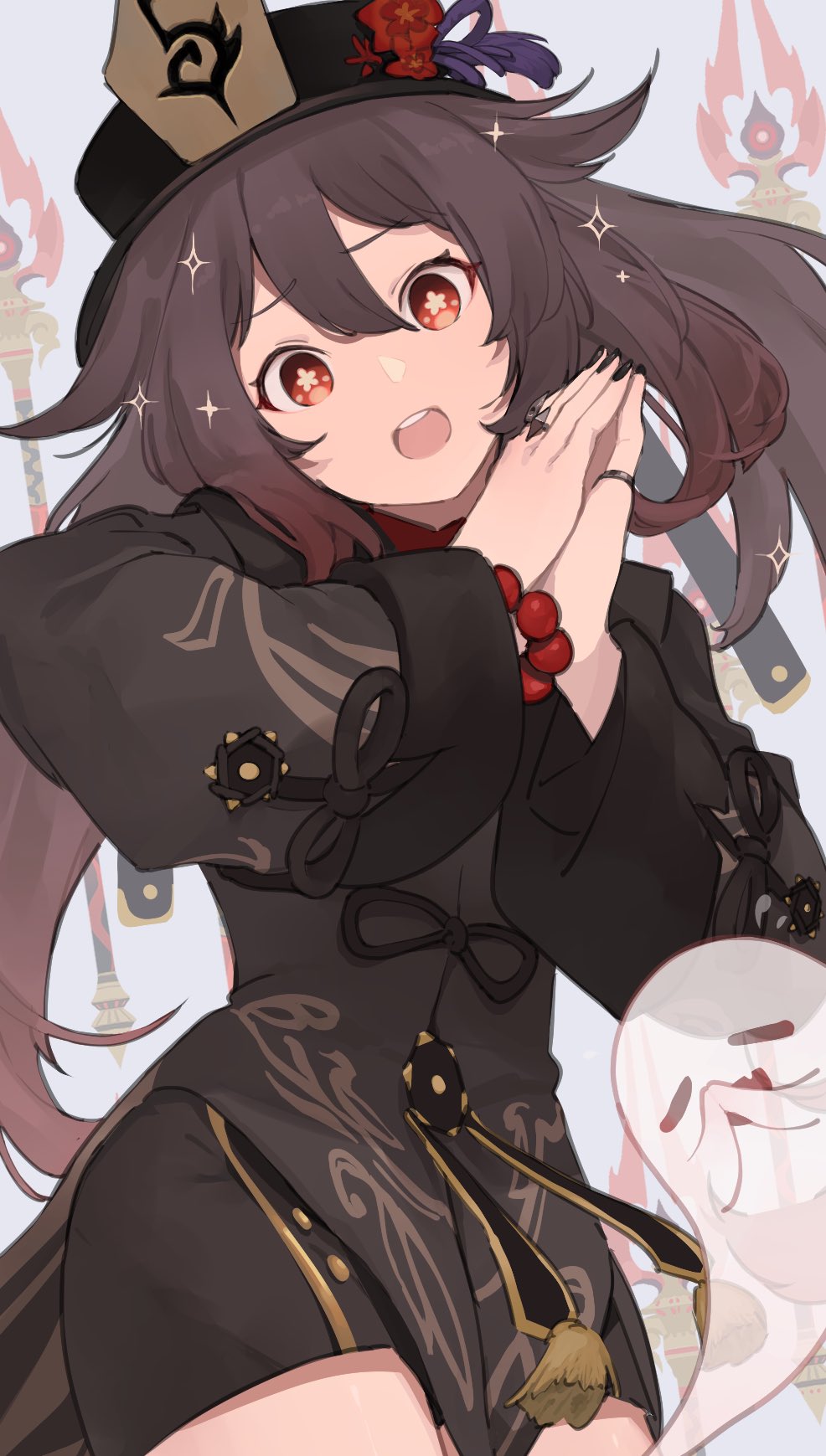 1girl black_bow black_coat black_hat black_nails black_shorts blue_background boo_tao_(genshin_impact) bow bracelet brown_hair buttons chinese_clothes closed_eyes coat collared_coat commentary_request fang fingernails flower flower-shaped_pupils flying genshin_impact ghost gochiwa gradient_hair hair_between_eyes hands_clasped_in_delight hands_up hat hat_flower hat_ornament hat_ribbon hat_tassel highres hu_tao_(genshin_impact) jewelry long_fingernails long_hair long_sleeves looking_at_viewer mandarin_collar multicolored_hair nail_polish open_mouth own_hands_together purple_ribbon red_eyes red_flower red_hair red_shirt ribbon ring shirt shorts simple_background smile solo staff_of_homa_(genshin_impact) standing star_(symbol) symbol-shaped_pupils tassel teeth tongue twintails weapon wide_sleeves wing_collar yellow_flower