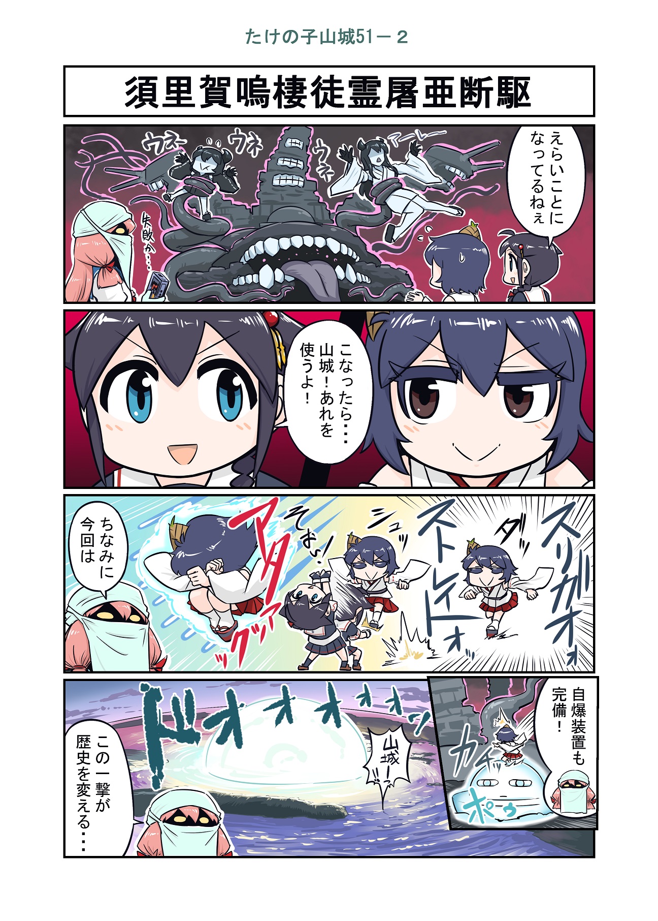 5girls abyssal_ship ahoge akashi_(kancolle) bamboo_shoot black_hair black_serafuku black_shirt black_skirt blue_eyes blunt_tresses braid brown_eyes detached_sleeves hair_flaps hair_ornament hair_over_shoulder hair_ribbon hakama hakama_short_skirt hakama_skirt highres horns japanese_clothes kantai_collection long_hair miniskirt multiple_girls night_strait_princess_(black) night_strait_princess_(white) nontraditional_miko pale_skin pink_hair pleated_skirt red_hakama ribbon school_uniform seiran_(mousouchiku) serafuku shigure_(kancolle) shigure_kai_ni_(kancolle) shirt short_hair single_braid skirt speech_bubble tress_ribbon wide_sleeves yamashiro_(kancolle)