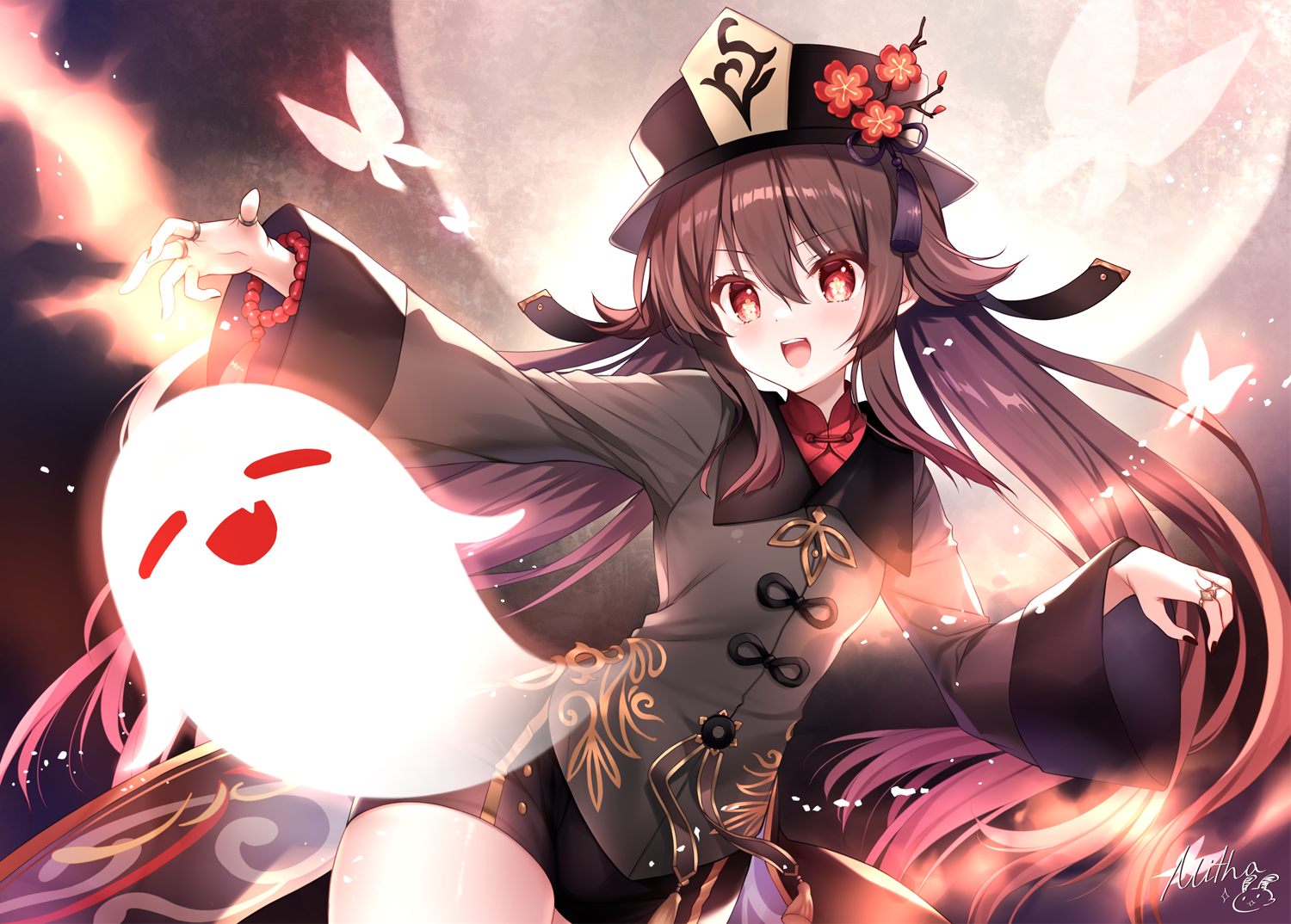 1girl :d bead_bracelet beads black_hat black_shorts bracelet brown_hair bug butterfly closed_eyes commentary_request fang flower flower-shaped_pupils full_moon genshin_impact ghost grey_jacket hair_between_eyes hat hat_flower hu_tao_(genshin_impact) insect jacket jewelry long_hair long_sleeves mitha moon open_mouth red_eyes red_flower red_shirt ring shirt short_shorts shorts signature smile solo symbol-shaped_pupils very_long_hair
