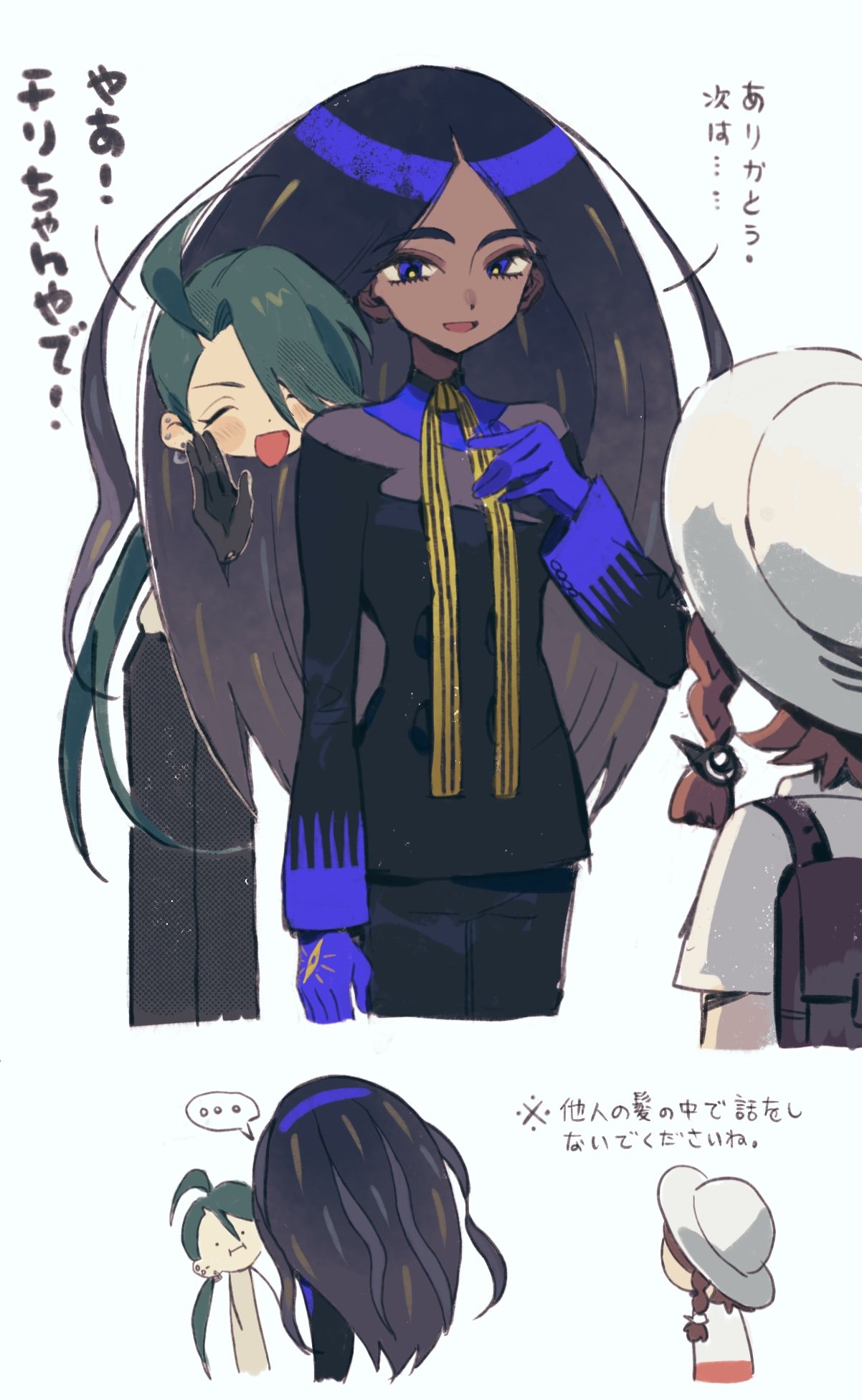 ... 3girls :d :i ahoge black_hair black_jacket black_pants blue_eyes blue_gloves blush braid brown_hair buttons celeste67491740 closed_eyes closed_mouth commentary_request dark-skinned_female dark_skin earrings geeta_(pokemon) gloves green_hair hand_up hat highres jacket jewelry juliana_(pokemon) long_hair long_sleeves multiple_girls neck_ribbon nintendo open_mouth pants pokemon pokemon_sv ribbon rika_(pokemon) smile spoken_ellipsis translation_request white_background yellow_ribbon