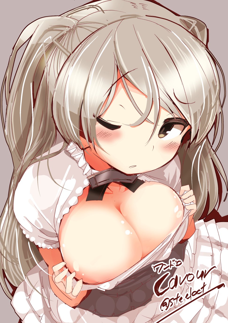 1girl armpit_cutout blush breasts brown_eyes cleavage_cutout clothing_cutout conte_di_cavour_(kancolle) conte_di_cavour_nuovo_(kancolle) corset dress frilled_dress frills grey_dress grey_hair highres kantai_collection large_breasts layered_dress long_hair long_sleeves nijou_katame one_eye_closed solo two-tone_dress two_side_up white_dress