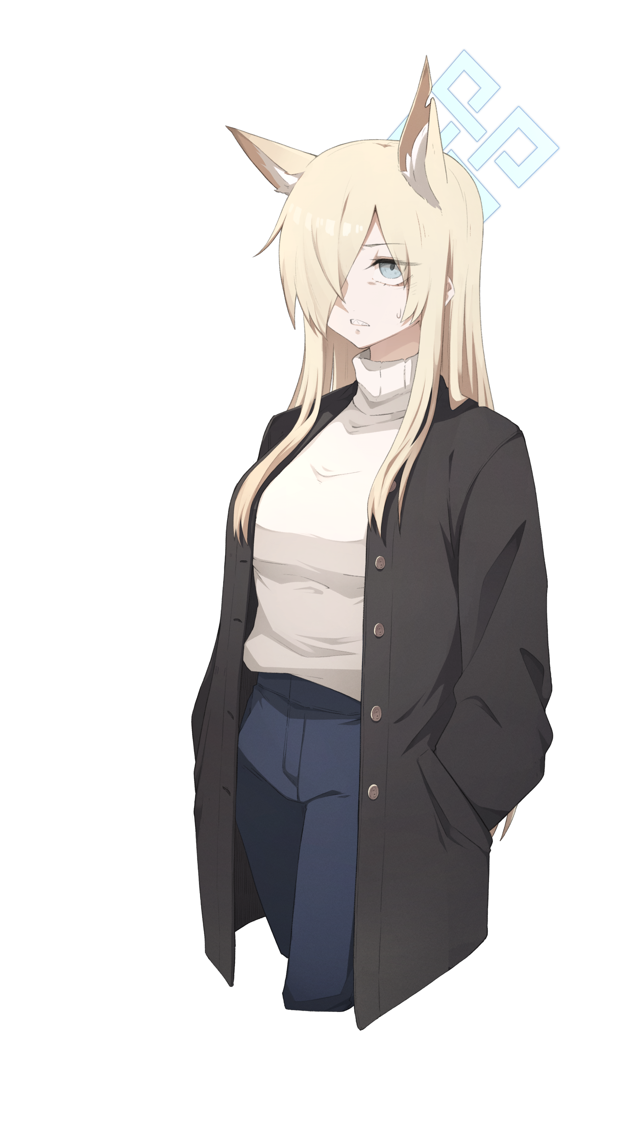 1girl absurdres alternate_costume animal_ear_fluff animal_ears black_jacket blonde_hair blue_archive blue_eyes blue_pants blush cropped_legs expressionless extra_ears hair_over_one_eye halo hands_in_pockets highres if_f jacket kanna_(blue_archive) long_hair long_sleeves open_clothes open_jacket open_mouth pants sharp_teeth shirt simple_background solo standing sweatdrop sweater teeth white_background white_sweater