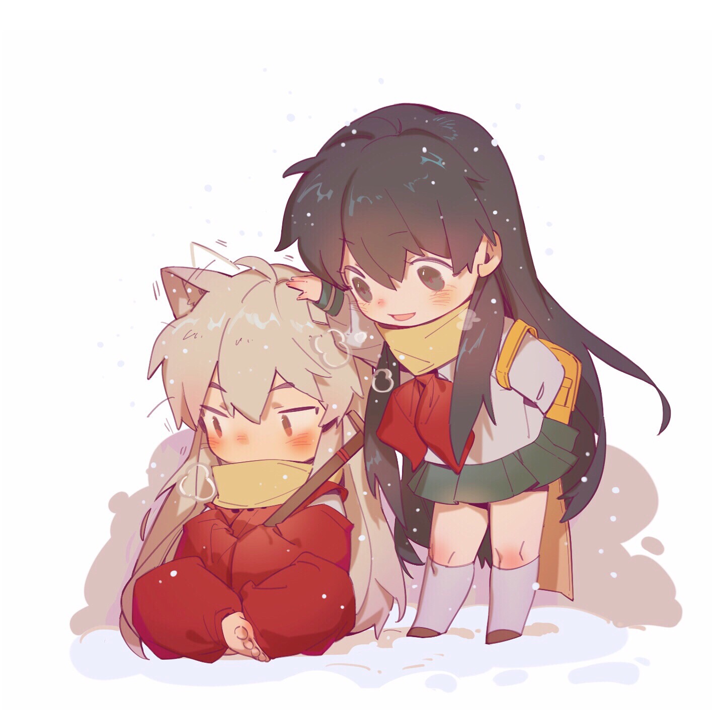 1boy 1girl afterimage alternate_hair_length alternate_hairstyle animal_ears arm_up backpack bag barefoot black_hair blush chibi dog_ears ear_wiggle full_body green_skirt grey_hair hand_on_another's_head hands_in_opposite_sleeves headpat highres higurashi_kagome indian_style inuyasha inuyasha_(character) japanese_clothes kariginu kneehighs leaning_forward lili3639 long_hair long_sleeves looking_at_another looking_away looking_down miniskirt neckerchief on_ground pants pleated_skirt red_neckerchief red_pants scarf school_uniform serafuku shoes sideways_glance simple_background sitting skirt smile snow snowing socks standing sword very_long_hair weapon white_background white_socks wide_sleeves winter yellow_scarf