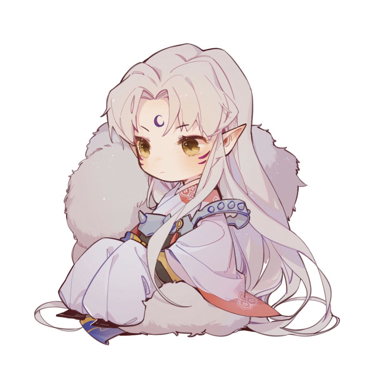 1boy armor chibi crescent crescent_facial_mark facial_mark forehead_mark full_body fur_shawl grey_hair inuyasha japanese_clothes kimono knees_up lili3639 long_hair long_sleeves looking_away male_focus parted_bangs pauldrons pointy_ears puffy_pants sash sesshoumaru shawl shoes shoulder_armor shoulder_spikes simple_background sitting solo spikes very_long_hair white_background wide_sleeves yellow_eyes