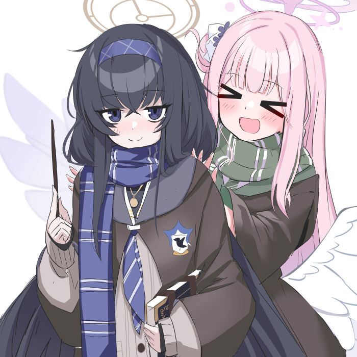 >_< 2girls :d angel_wings bags_under_eyes black_hair blue_archive book check_copyright coat copyright_request hairband halo harry_potter_(series) holding holding_book mika_(blue_archive) multiple_girls open_mouth pink_hair purple_eyes scarf shooka simple_background smile ui_(blue_archive) white_background wings wizarding_world xd