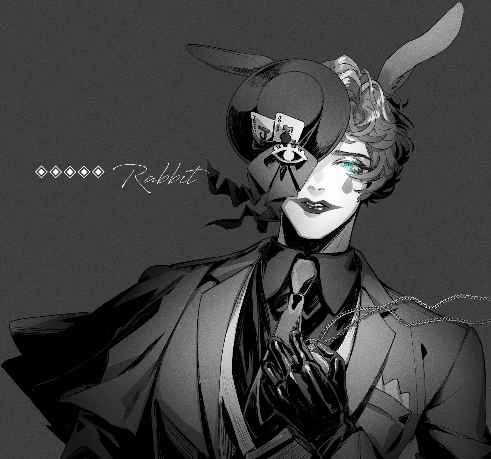 1boy animal_ears aqua_eyes business_suit collared_shirt formal_clothes gloves greyscale hand_up hat highres jacket joe_rikiichi male_focus mini_hat mini_top_hat monochrome necktie nijisanji one_eye_covered pocket_watch rabbit_ears sazanamiryo shirt short_hair solo spot_color suit top_hat upper_body virtual_youtuber watch