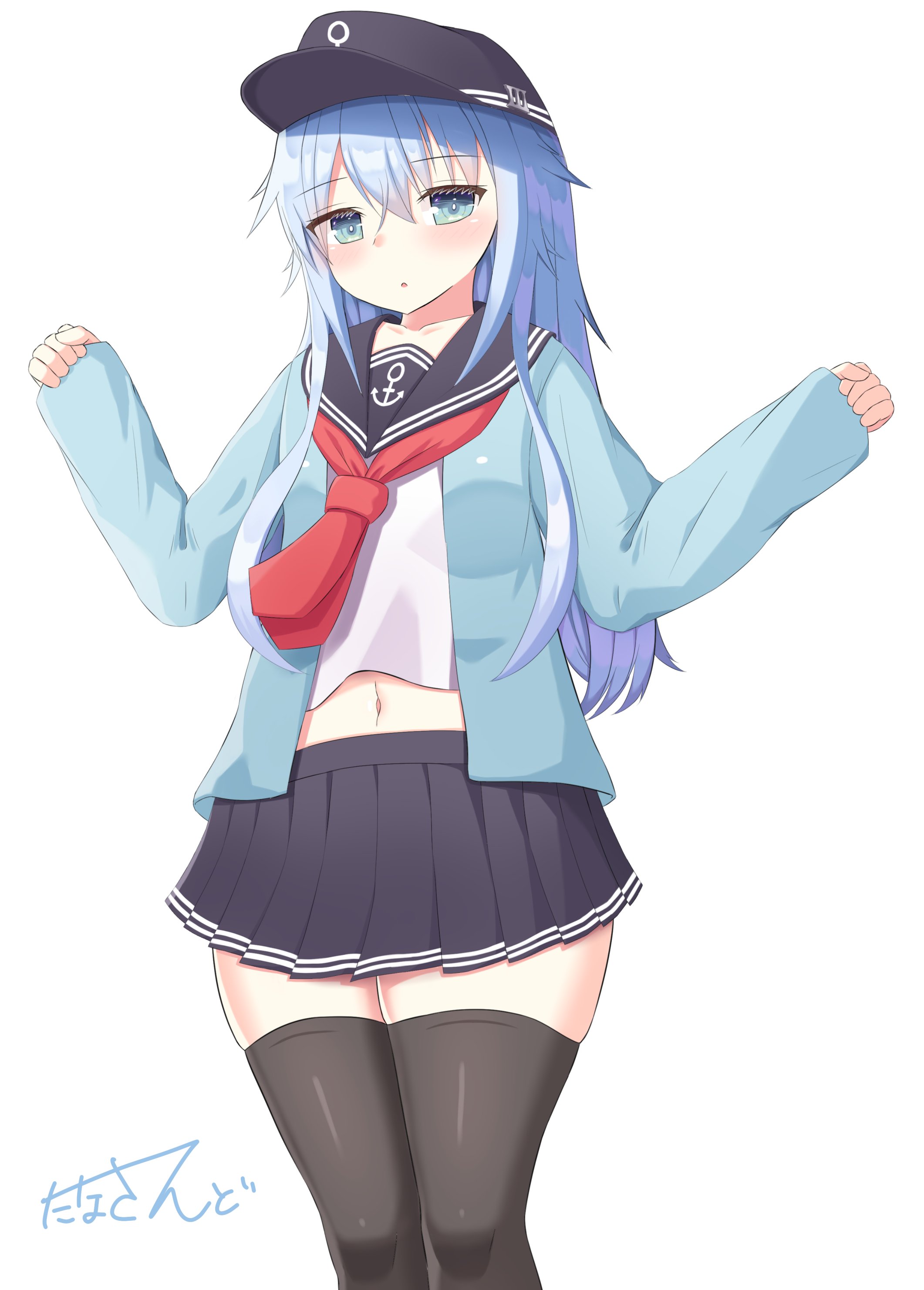 absurdres anchor_symbol black_thighhighs blue_eyes blue_sweater flat_cap hat hibiki_(kancolle) highres kantai_collection long_hair navel pleated_skirt school_uniform serafuku signature simple_background skirt sweater thick_thighs thighhighs thighs tuna-nuki_tanasando white_hair zettai_ryouiki