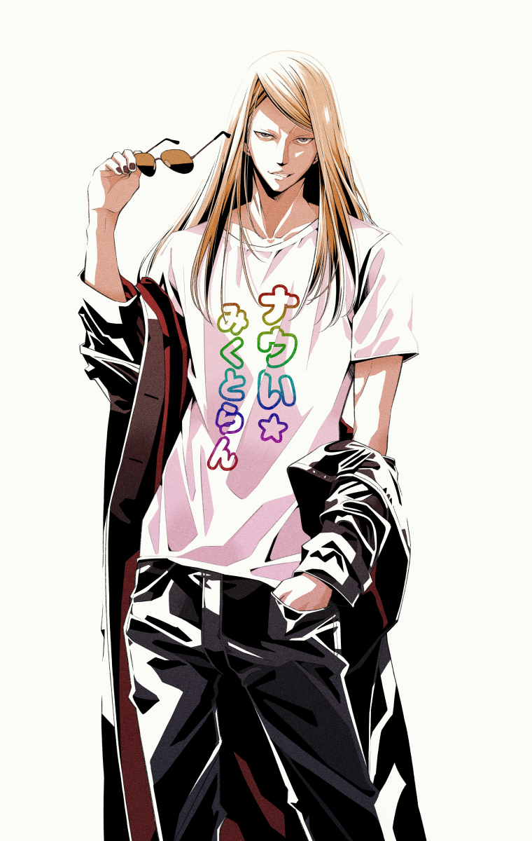 1boy blonde_hair commentary_request unworn_eyewear fate/grand_order fate_(series) green_eyes hand_in_pocket highres holding holding_removed_eyewear long_coat long_hair looking_at_viewer shirt sneer solo sunglasses t-shirt tezcatlipoca_(fate) tsukumo_(soar99) upper_body white_background white_shirt