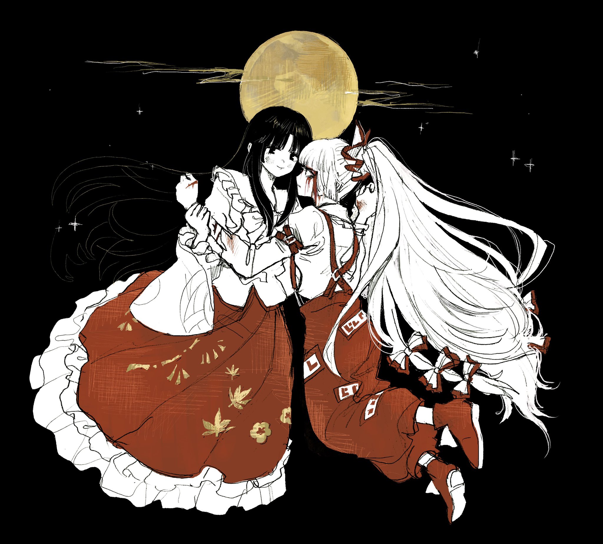 2girls arm_grab arm_strap black_hair blood blood_on_face bow closed_mouth commentary_request cuts face-to-face fujiwara_no_mokou full_body hair_bow highres houraisan_kaguya injury limited_palette long_hair long_sleeves moon multiple_girls ofuda ofuda_on_clothes pants parted_lips ponytail red_footwear red_pants red_skirt shirt skirt smile subaru_(user_tmwv7722) suspenders torn_clothes torn_shirt touhou very_long_hair white_hair white_shirt