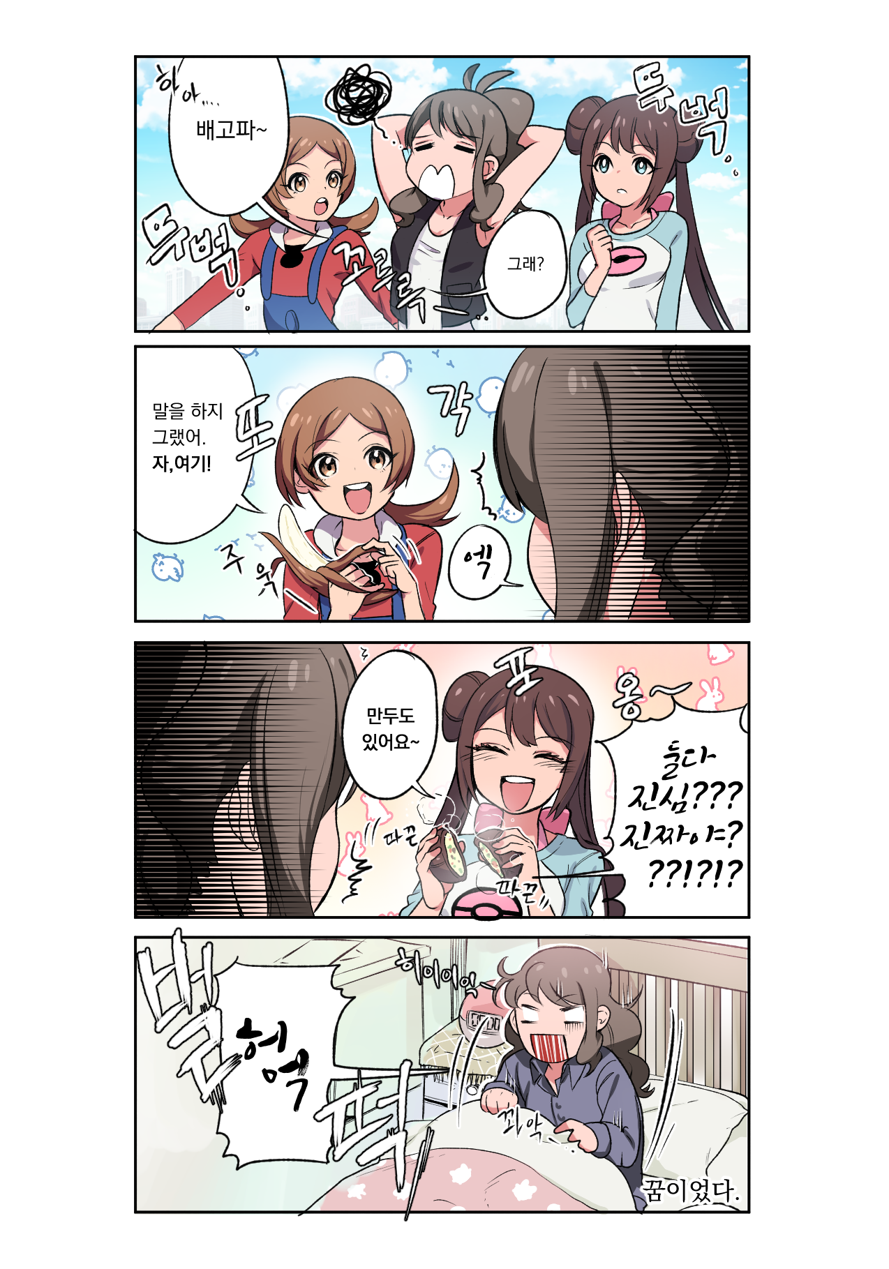 0_0box 3girls 4koma :d alarm_clock black_vest blue_overalls border brown_eyes brown_hair clock closed_eyes comic commentary donut_hair_bun double_bun dreaming eyelashes hair_bun highres hilda_(pokemon) holding korean_text long_hair lyra_(pokemon) multiple_girls nintendo on_bed open_mouth overalls pillow pokemon pokemon_black_and_white pokemon_black_2_and_white_2 pokemon_heartgold_and_soulsilver red_shirt rosa_(pokemon) shirt sleeveless sleeveless_shirt smile speech_bubble squiggle steam teeth translation_request twintails under_covers upper_teeth_only vest waking_up white_border white_shirt