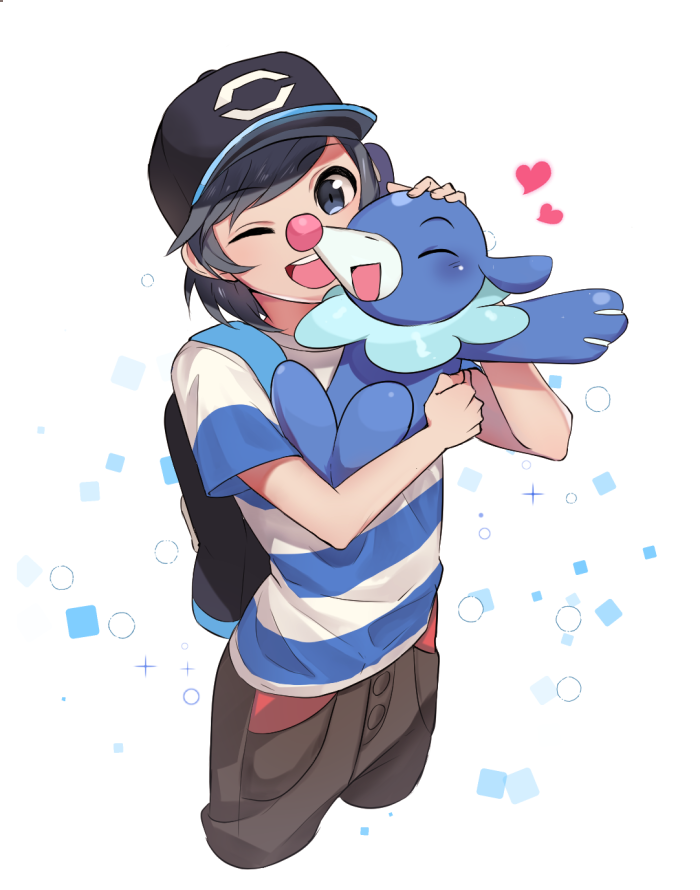 0_0box 1boy ;d baseball_cap black_hair black_headwear brown_pants commentary elio_(pokemon) gen_7_pokemon grey_eyes hands_up hat heart holding holding_pokemon male_focus nintendo one_eye_closed open_mouth pants pokemon pokemon_(creature) pokemon_sun_and_moon popplio shirt short_sleeves smile striped_clothes striped_shirt t-shirt teeth tongue upper_teeth_only white_background