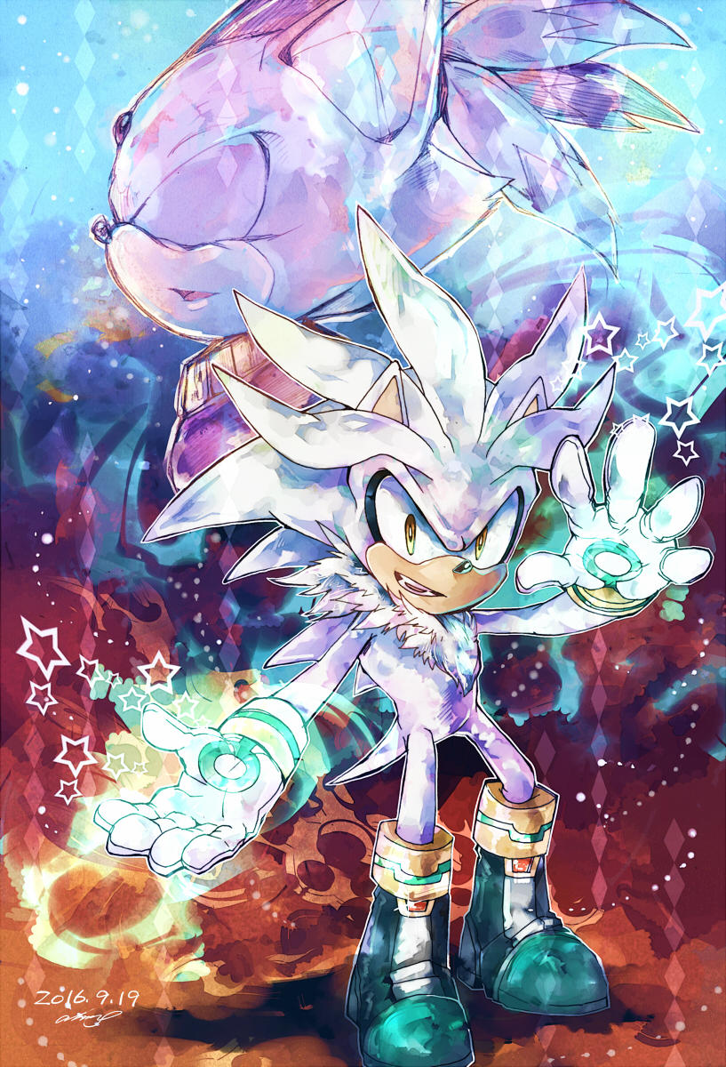 1boy 1girl aimf animal_ears animal_nose black_footwear blaze_the_cat blue_background body_fur boots bracelet cat_ears cat_girl closed_eyes commentary dated english_commentary eyelashes forehead_jewel full_body furry furry_female furry_male gem gloves gold_bracelet gradient_background hands_up hedgehog highres jacket jewelry long_sleeves looking_at_viewer magic multicolored_background open_mouth orange_background purple_background purple_fur purple_gem purple_jacket red_background short_tail silver_the_hedgehog smile sonic_(series) standing star_(symbol) tail teeth tongue upper_body white_fur white_gloves yellow_eyes