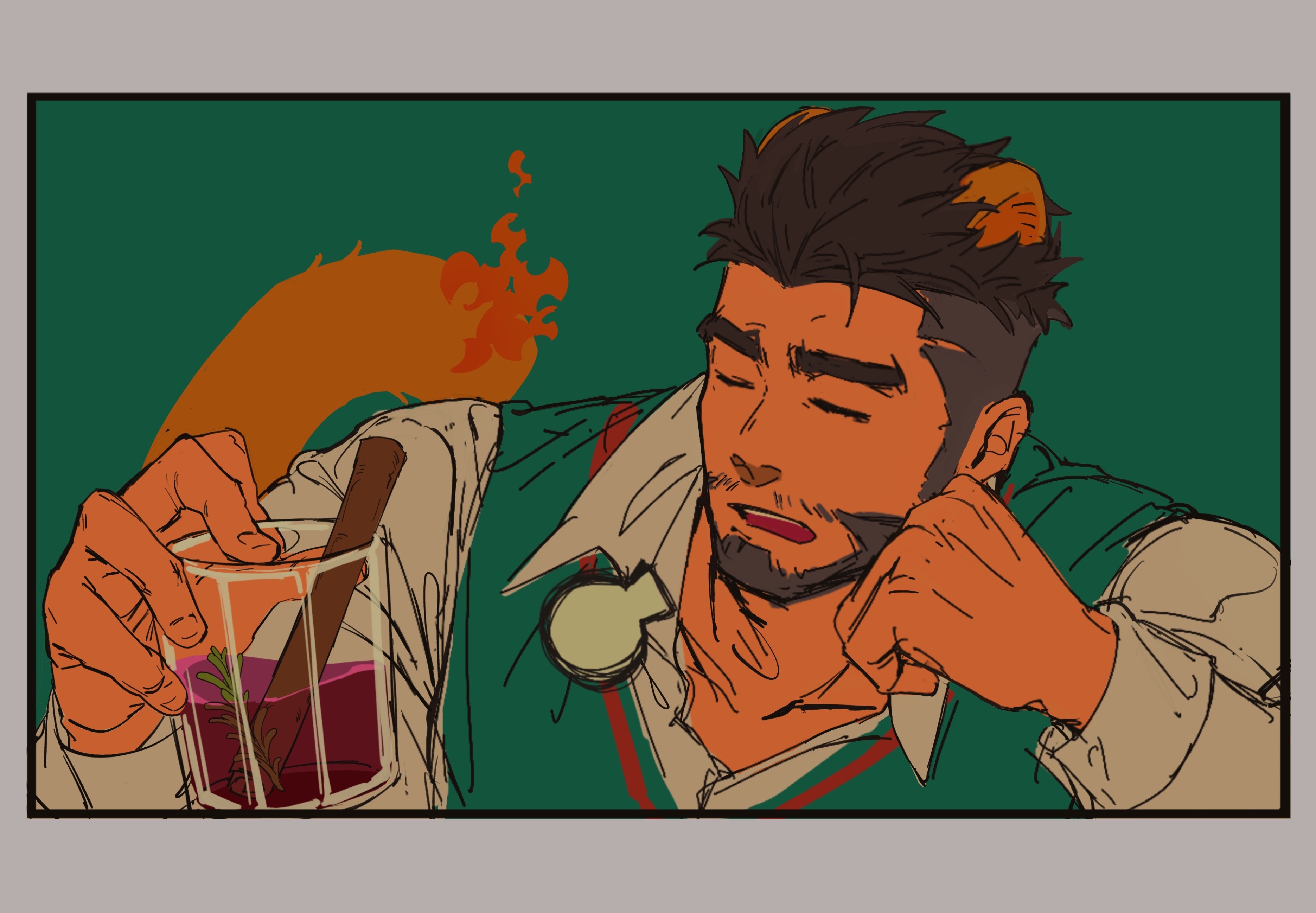 1boy absurdres alca_(wakatanka4) alternate_costume animal_ears bad_id bad_weibo_id bara beard black_hair christmas closed_eyes collared_shirt cup elbow_rest facial_hair fire flame-tipped_tail gyee highres holding holding_cup holding_letter kuroshima_kurishiro_(muyi24108414) letter lion_boy lion_ears lion_tail male_focus mature_male original shirt short_hair sigh solo tail thick_eyebrows undercut upper_body vest