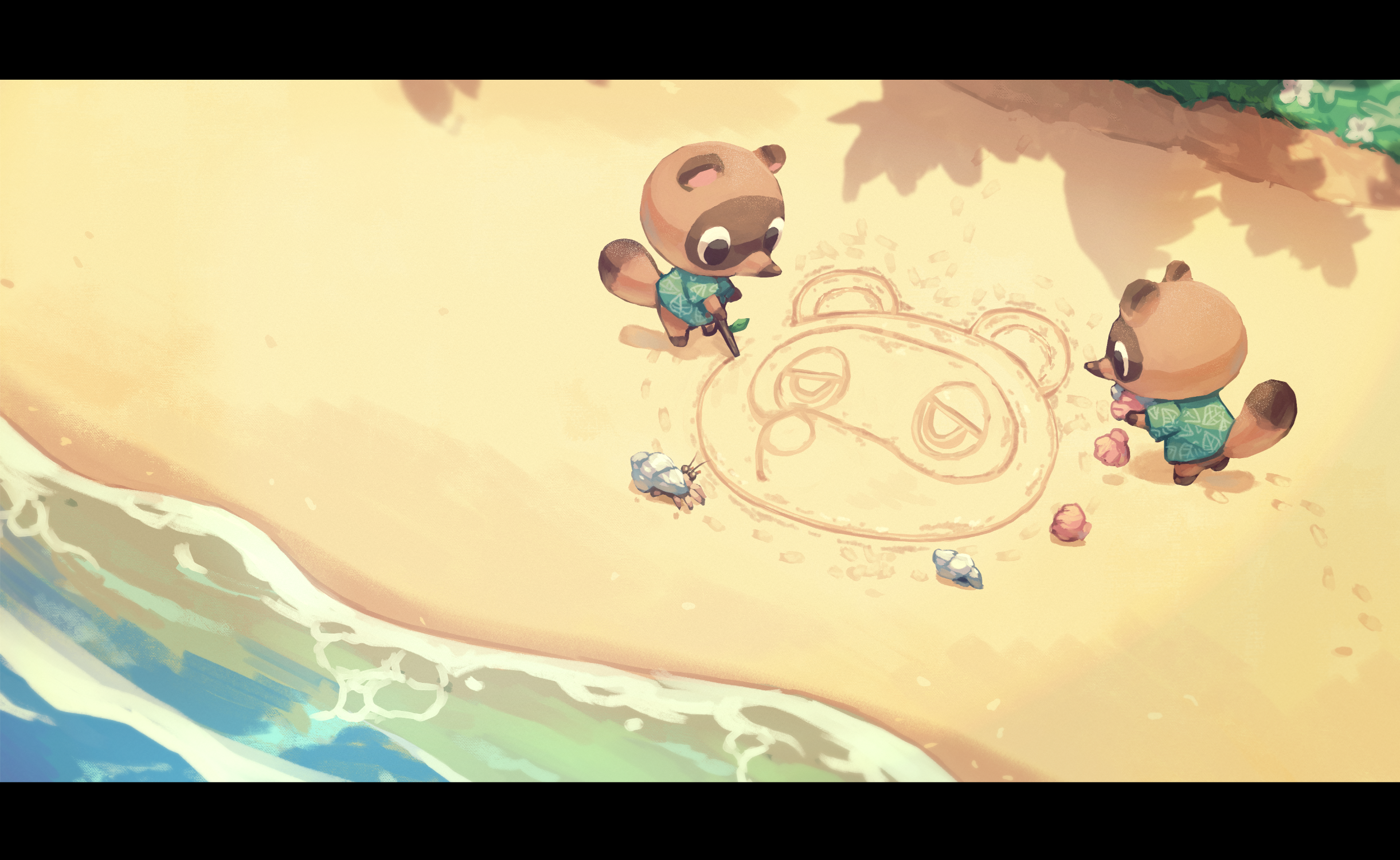 2boys animal_crossing animal_crossing:_new_horizons animal_ears beach black_eyes blue_shirt commentary_request crab footprints full_body furry furry_male hawaiian_shirt hermit_crab highres holding holding_stick leaf_print letterboxed multiple_boys nintendo print_shirt raccoon raccoon_ears raccoon_tail saino_misaki sand seashell shadow shell shirt shore short_sleeves standing stick tail timmy_(animal_crossing) tom_nook_(animal_crossing) tommy_(animal_crossing) water