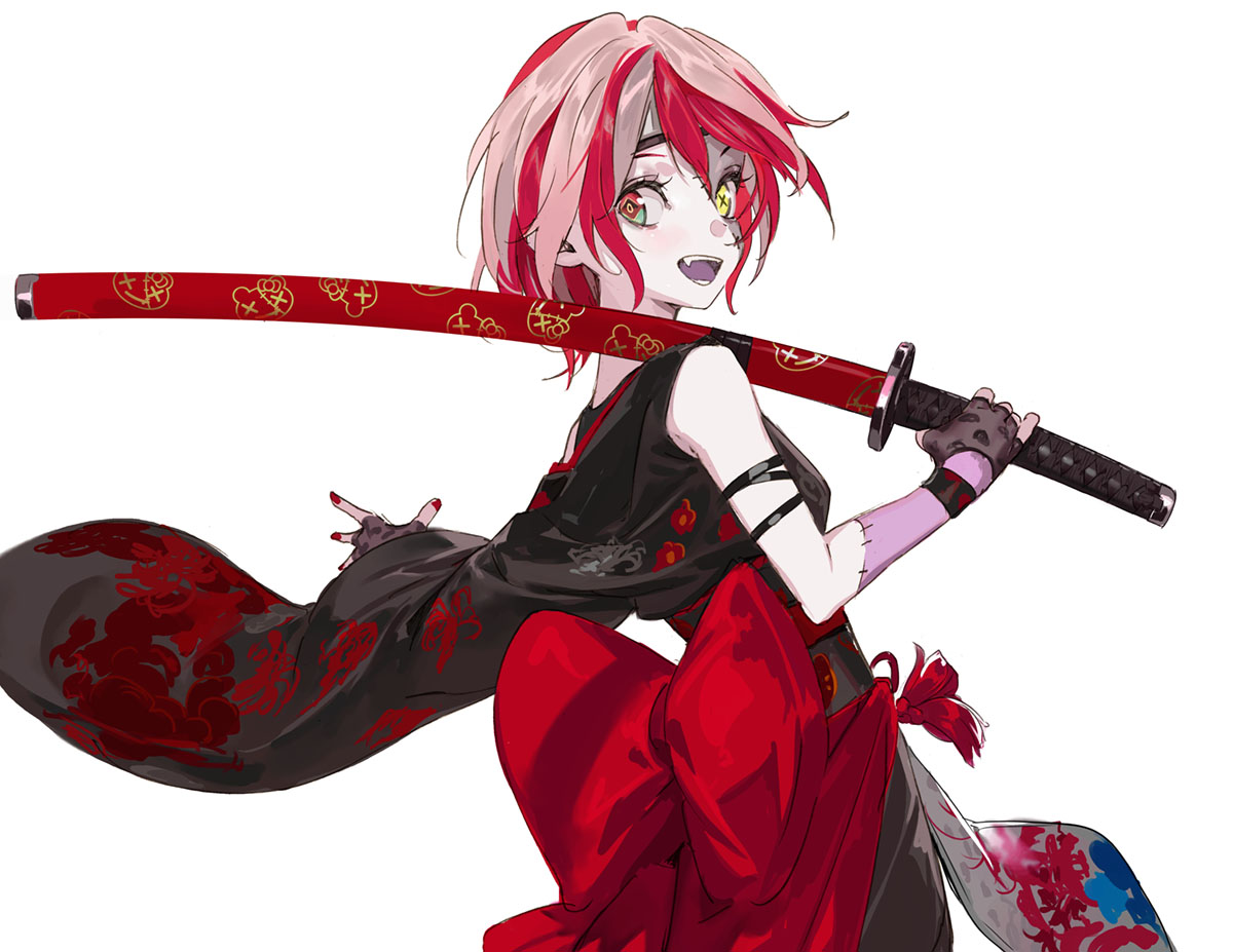 1girl black_kimono colored_skin diamond-shaped_pupils diamond_(shape) fangs fingerless_gloves floral_print forehead_protector gloves green_eyes grey_skin heterochromia holding holding_sword holding_weapon hololive hololive_indonesia japanese_clothes katana kimono kureiji_ollie kureiji_ollie_(new_year) mismatched_pupils multicolored_hair multicolored_skin official_alternate_costume pako_(pakosun) patchwork_skin pink_hair red_eyes red_hair red_nails sash scabbard sheath sheathed short_hair simple_background solo stitched_arm stitched_face stitches sword symbol-shaped_pupils teeth virtual_youtuber weapon white_background wide_sleeves x-shaped_pupils yellow_eyes zombie