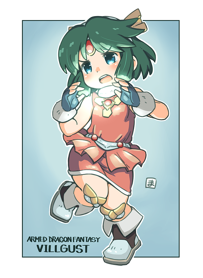 1girl blue_background blue_gloves boots border circlet copyright_name dress fingerless_gloves full_body gloves green_eyes green_hair kouryuu_densetsu_villgust magic mawaru_(mawaru) open_mouth orange_dress orb remi_(villgust) short_hair sleeveless sleeveless_dress solo v-shaped_eyebrows white_border
