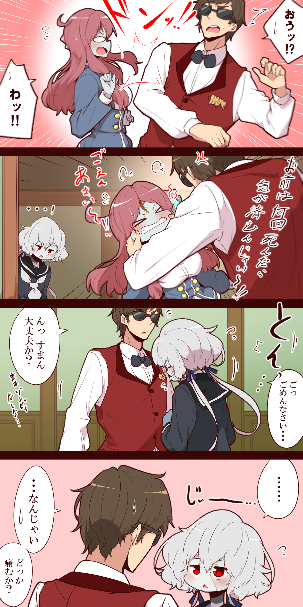 1boy 2girls anger_vein bow bowtie breasts brown_hair clenched_teeth closed_eyes comic commentary_request grey_hair hands_on_another's_cheeks hands_on_another's_face highres jacket konno_junko long_hair medium_breasts minamoto_sakura multiple_girls red_eyes school_uniform short_hair sunglasses tatsumi_koutarou teeth translation_request triangle_mouth yonedatomo_mizu zombie zombie_land_saga