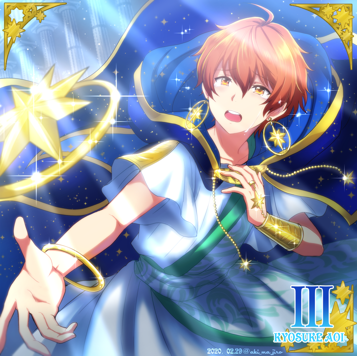 1boy 2020 ahoge aki_ma_jiro aoi_kyosuke blue_cloak bracelet character_name cloak dated earrings hair_between_eyes highres idolmaster idolmaster_side-m jewelry male_focus open_mouth orange_eyes outstretched_hand short_sleeves star_(symbol) tears teeth upper_teeth_only