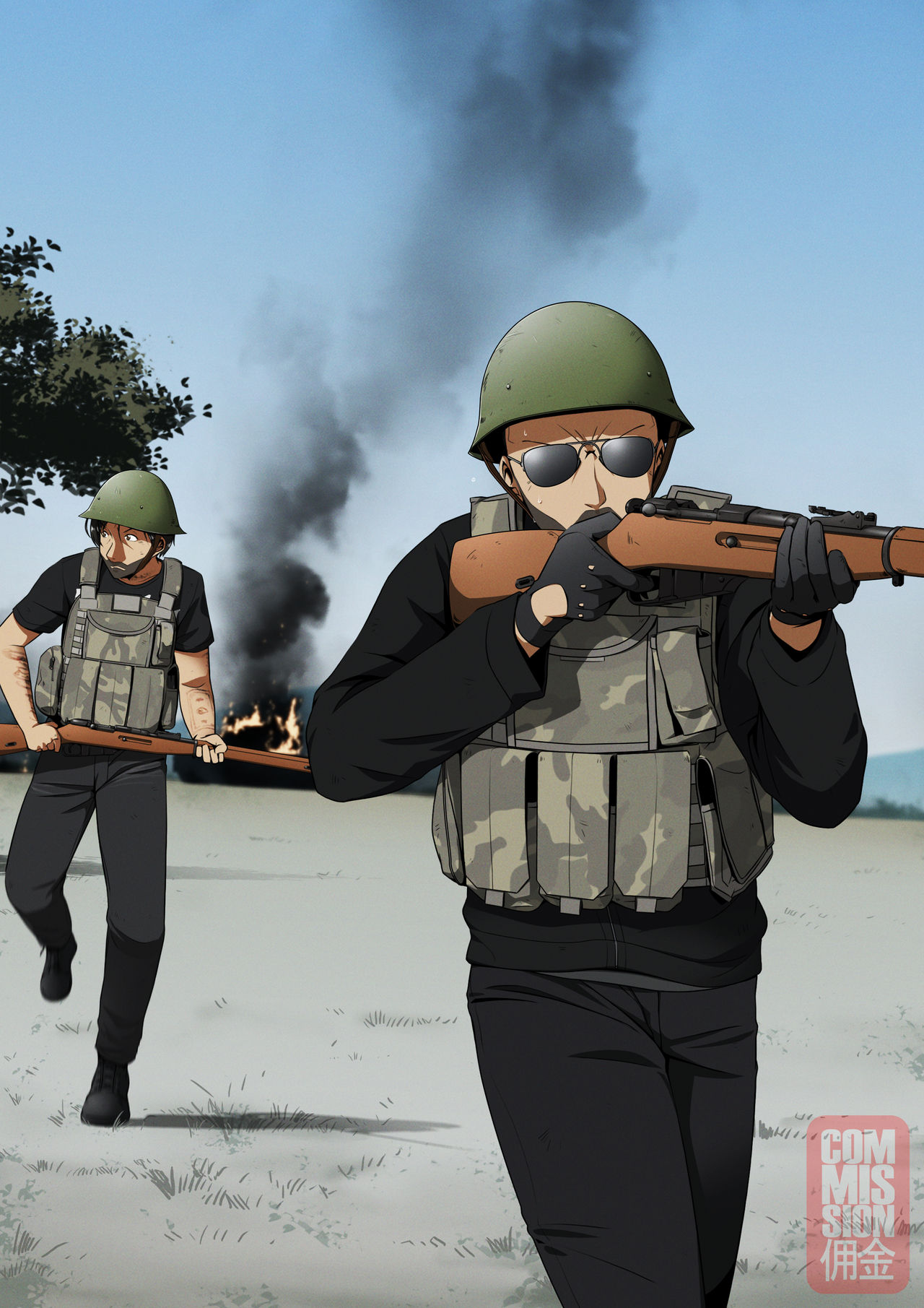 2boys aiming armor black_hair black_pants black_shirt bolt-action_rifle bolt_action commission facial_hair fire gloves gun helmet highres leaves military mosin-nagant mrxinom multiple_boys pants rifle shirt sunglasses tree weapon