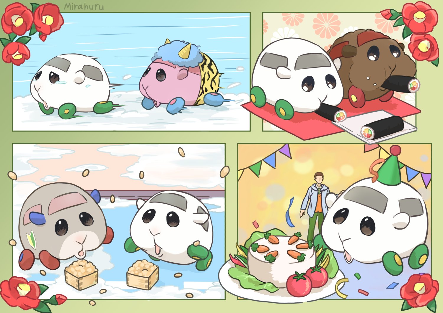 1boy artist_name birthday border brown_hair cake carrot character_request chasing commentary_request confetti crying crying_with_eyes_open eating flower food food_in_mouth food_on_face full_body green_border green_headwear green_pants grey_hoodie guinea_pig hat hood hood_down hoodie kikumon lettuce makizushi mirahuru07 molcar motion_lines open_clothes open_hoodie open_mouth pants party_hat pennant peter_(pui_pui_molcar) pui_pui_molcar red_flower shiromo's_driver_(pui_pui_molcar) shiromo_(pui_pui_molcar) short_hair shoshinsha_mark streamers string_of_flags sushi tears teddy_(pui_pui_molcar) tomato tray vegetable