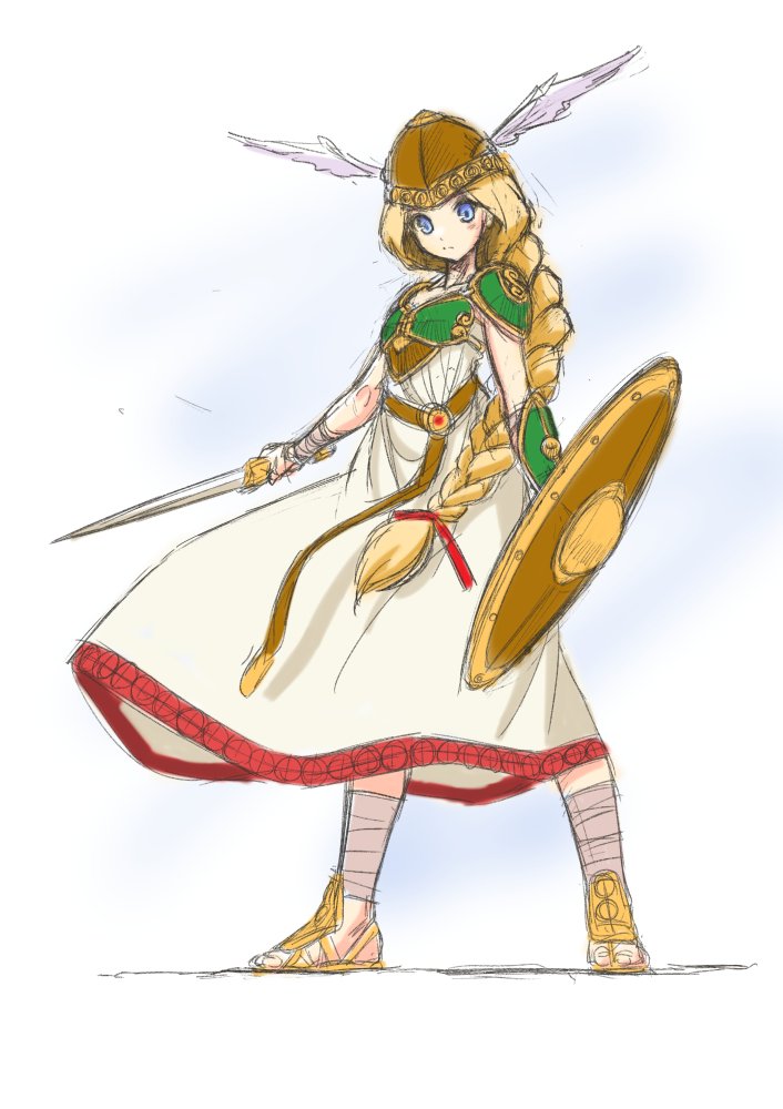 1girl armor bandaged_arm bandaged_leg bandages blonde_hair blue_eyes braid breastplate brown_headwear closed_mouth dress frown full_body green_armor hair_ribbon helmet holding holding_shield holding_sword holding_weapon legs_apart long_hair looking_at_viewer red_ribbon ribbon sandals shield shinjou_satomi shoulder_armor simple_background single_braid solo split_mouth standing sword valkyrie valkyrie_(vnd) valkyrie_no_densetsu weapon white_background white_dress winged_helmet yellow_sandals