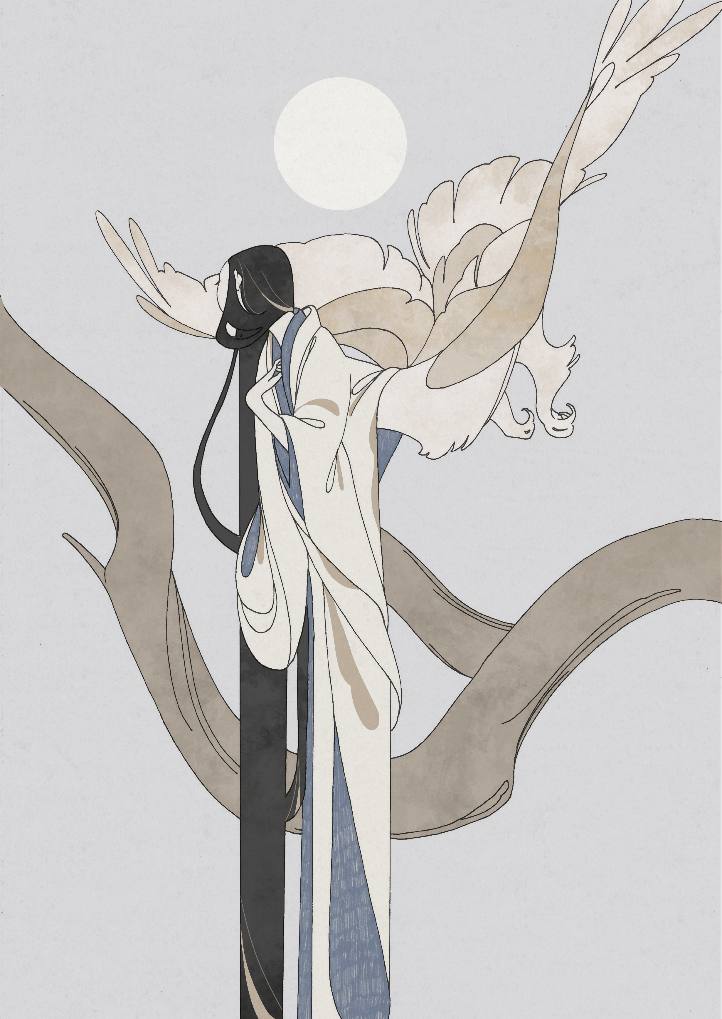 1girl absurdly_long_hair absurdres bird_girl bird_tail bird_wings black_hair branch brown_hair brown_tail brown_wings claws facing_away feathered_wings flying full_body grey_background hand_on_own_chest hand_up highres japanese_clothes kimono long_hair long_sleeves monster_girl moon multicolored_hair muted_color original simple_background solo streaked_hair surie tail taur very_long_hair very_long_sleeves wide_sleeves wings